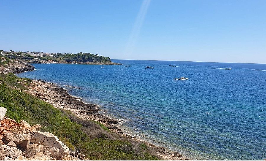 The curve of beach is made up of a small section of sand and pebbles mixed, and low reefs, like much Puglia's coast. The site of an ancient Messapic port (now buried under the sea and its bottom) there are "sand bars" that rise up to make the areas shallow. From the terrace piazza above the sea, you can descend to one side where the boat slip and beach is, or down the walkway ramp to the other side and the stone beach surrounded by macchia brush and some low reefs. The water is clear and pure here. Water shoes are highly recommended because of the rocks and reefs, to protect your feet.