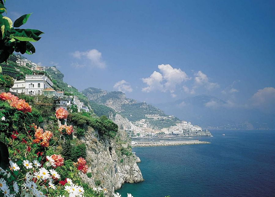 Reception settings include a sunlit veranda and an airy dining room that both frame Amalfi and the Mediterranean as a gently expressive backdrop.