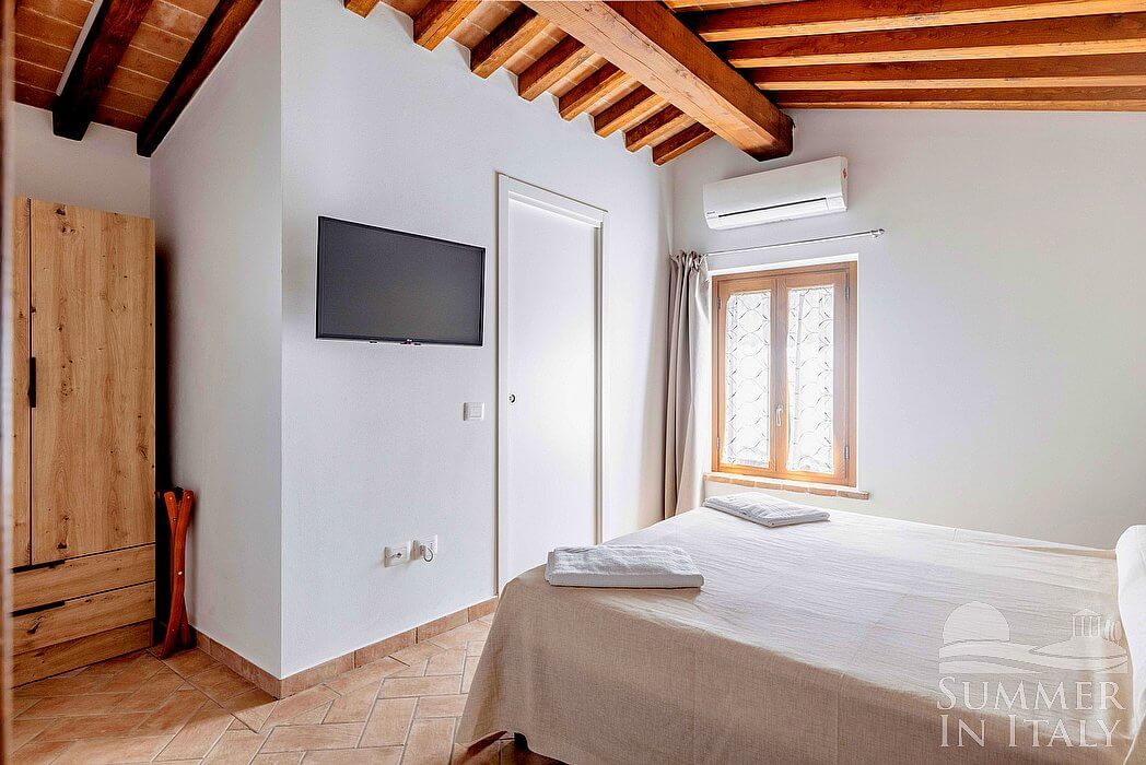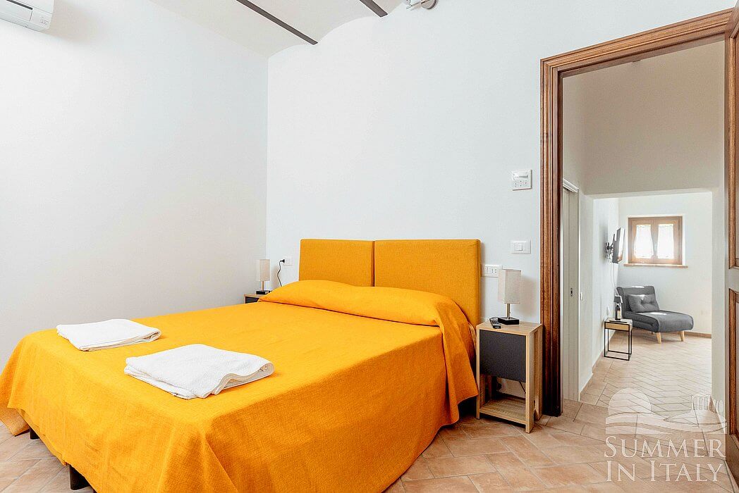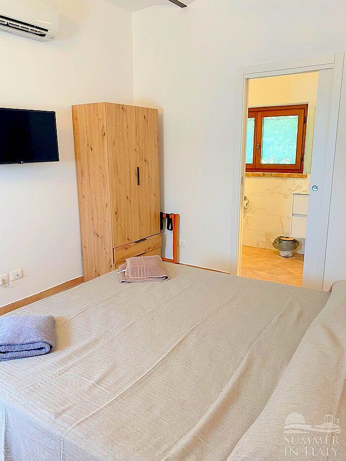 You will be able to enter the sixth bedroom from the kitchen through an access area, climbing three steps. The bedroom has a matrimonial bed (160 cm/63 inches, wider than a queen-size bed), that can be split into twins if requested (please contact our staff in advance to make arrangements). In this room you will find a satellite television (local channels). The room has a window, and it's equipped with an air conditioning/heating unit.