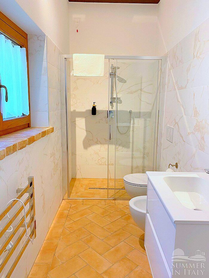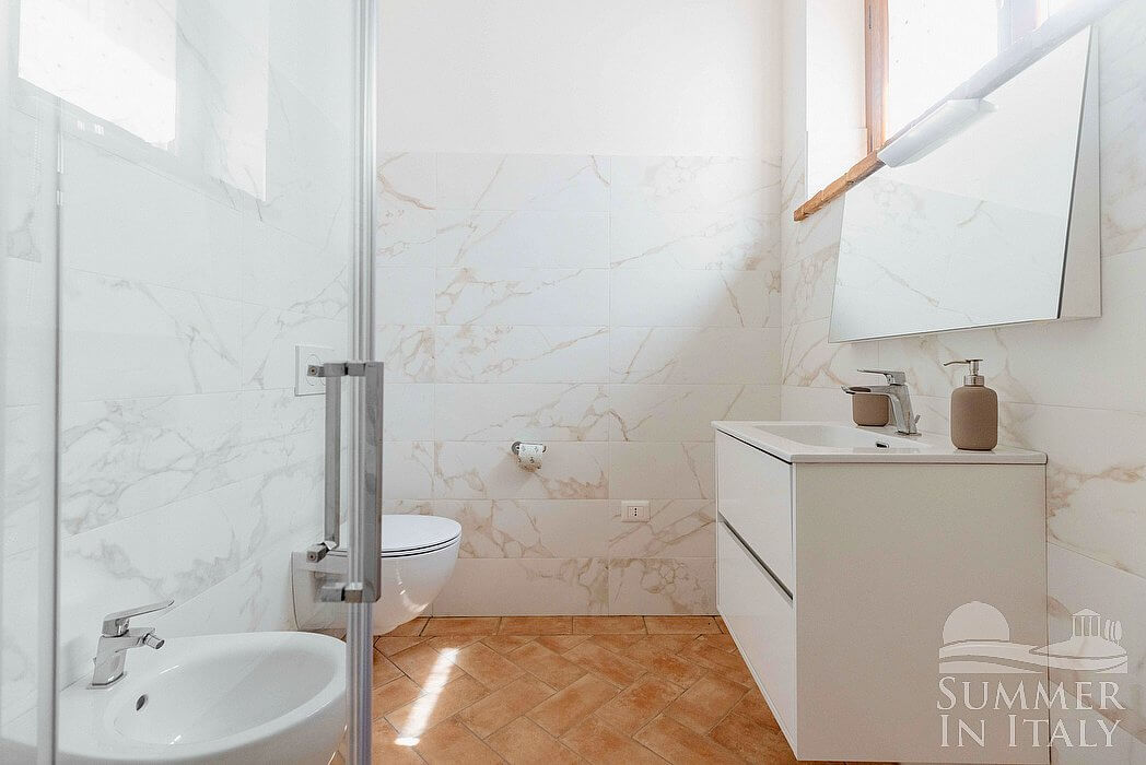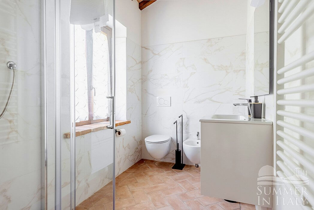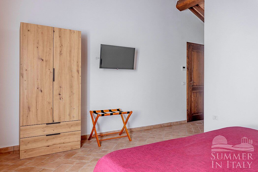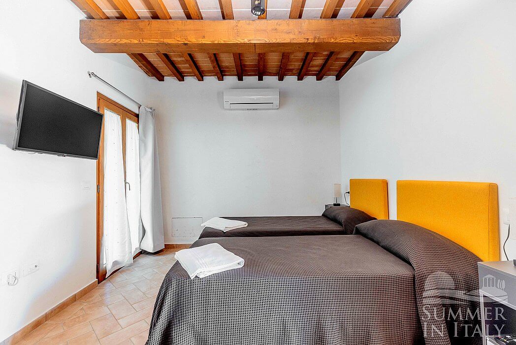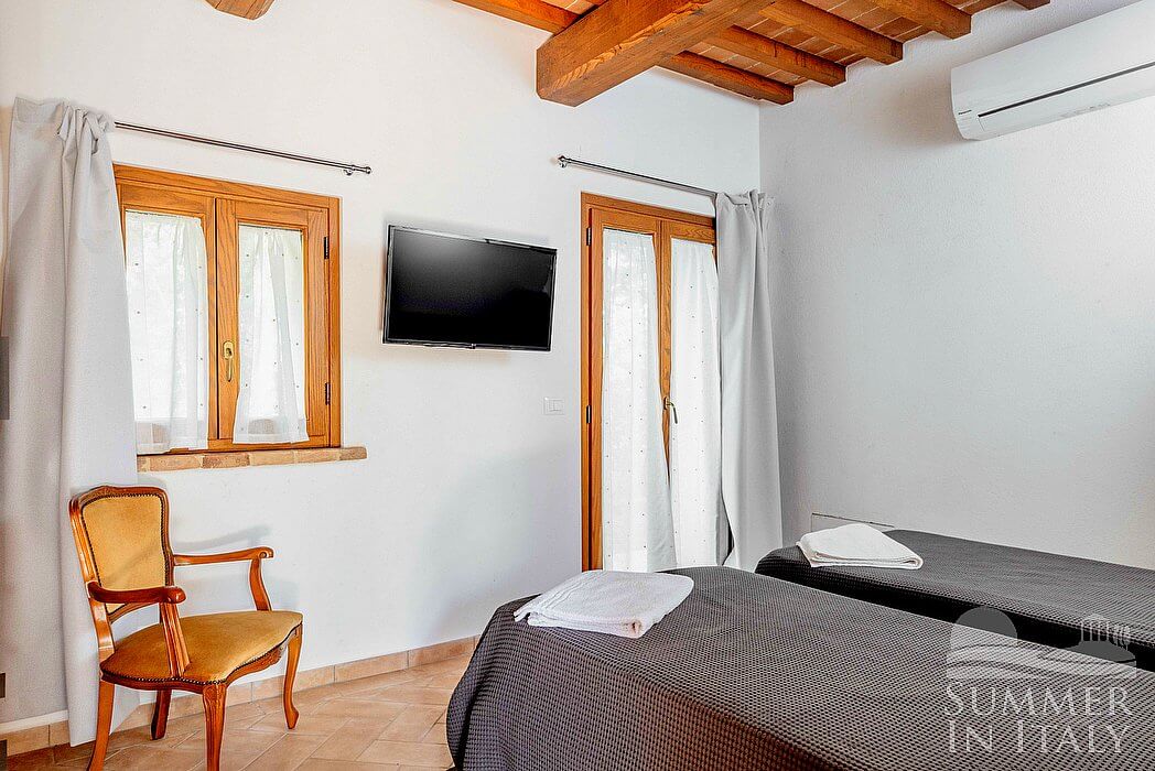 You will be able to enter the fifth bedroom from the kitchen. It has two twin beds (80 cm/32 inches), that can be pushed together into a matrimonial bed if requested (please contact our staff in advance to make arrangements). The furnishings include an armchair. In this room you will find a satellite television (local channels). From the bedroom you will be able to enter the garden through a French door. The room also has a window, and it's equipped with an air conditioning/heating unit. This bedroom has an en-suite bathroom, equipped with a washbasin, a toilet, a fully enclosed shower and a hairdryer.