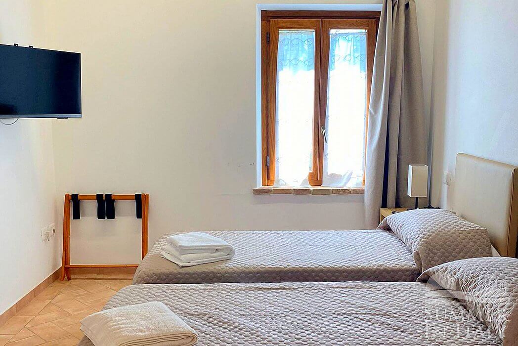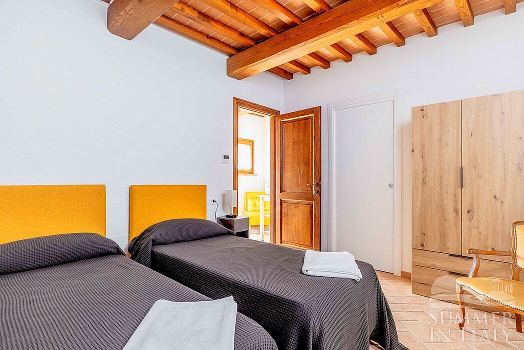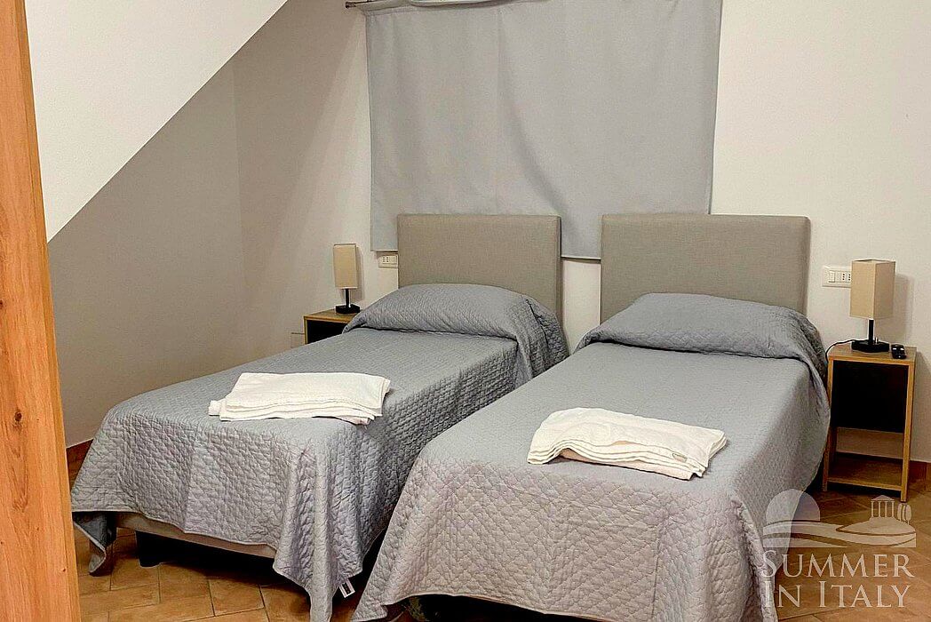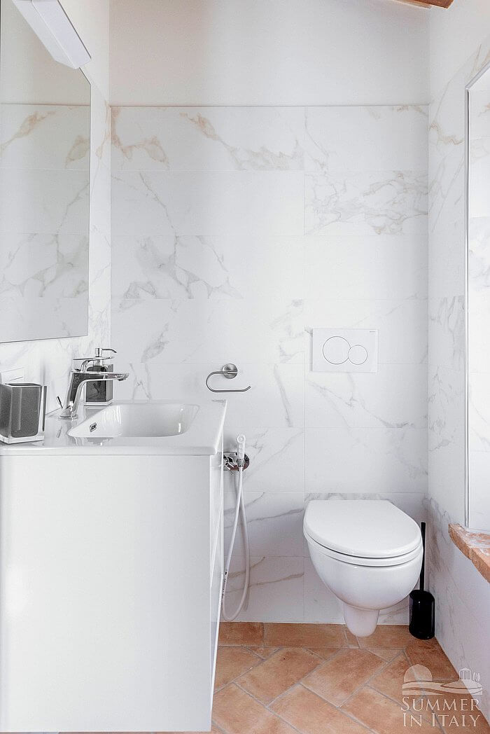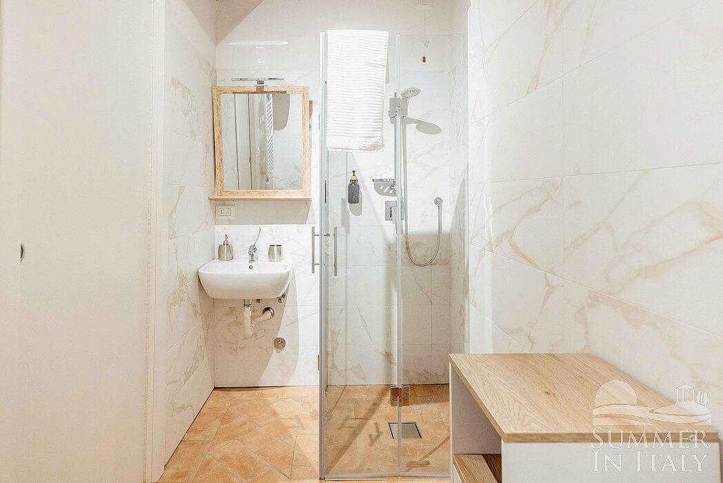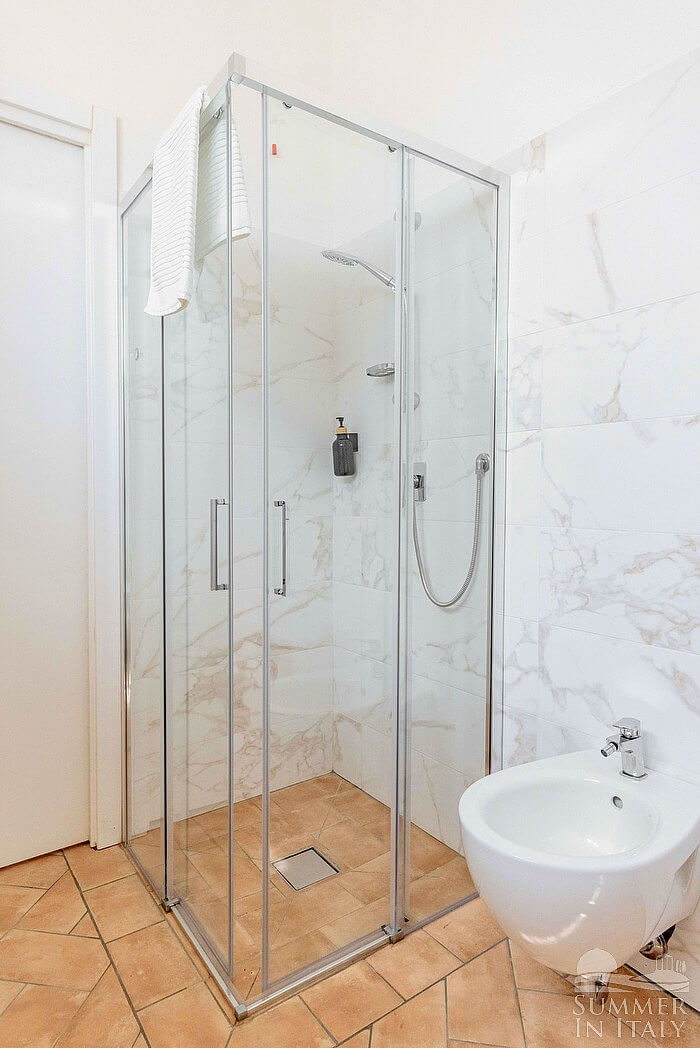 You will be able to enter the fifth bedroom from the kitchen. It has two twin beds (80 cm/32 inches), that can be pushed together into a matrimonial bed if requested (please contact our staff in advance to make arrangements). The furnishings include an armchair. In this room you will find a satellite television (local channels). From the bedroom you will be able to enter the garden through a French door. The room also has a window, and it's equipped with an air conditioning/heating unit. This bedroom has an en-suite bathroom, equipped with a washbasin, a toilet, a fully enclosed shower and a hairdryer.