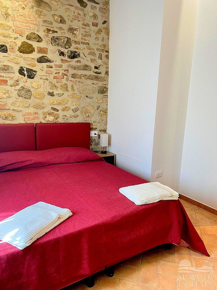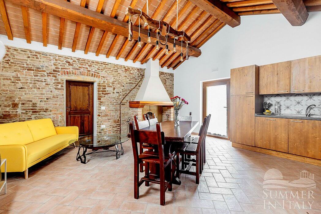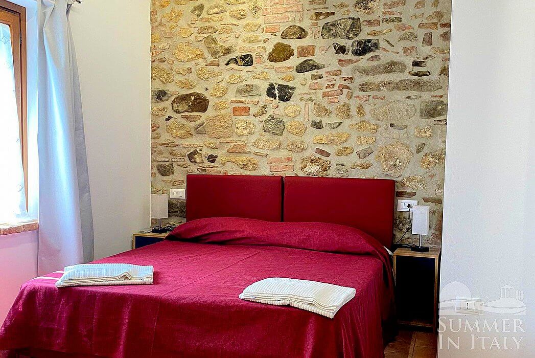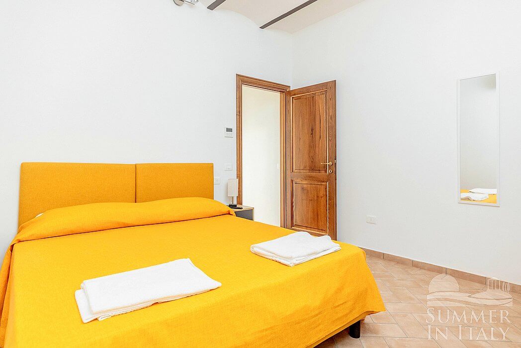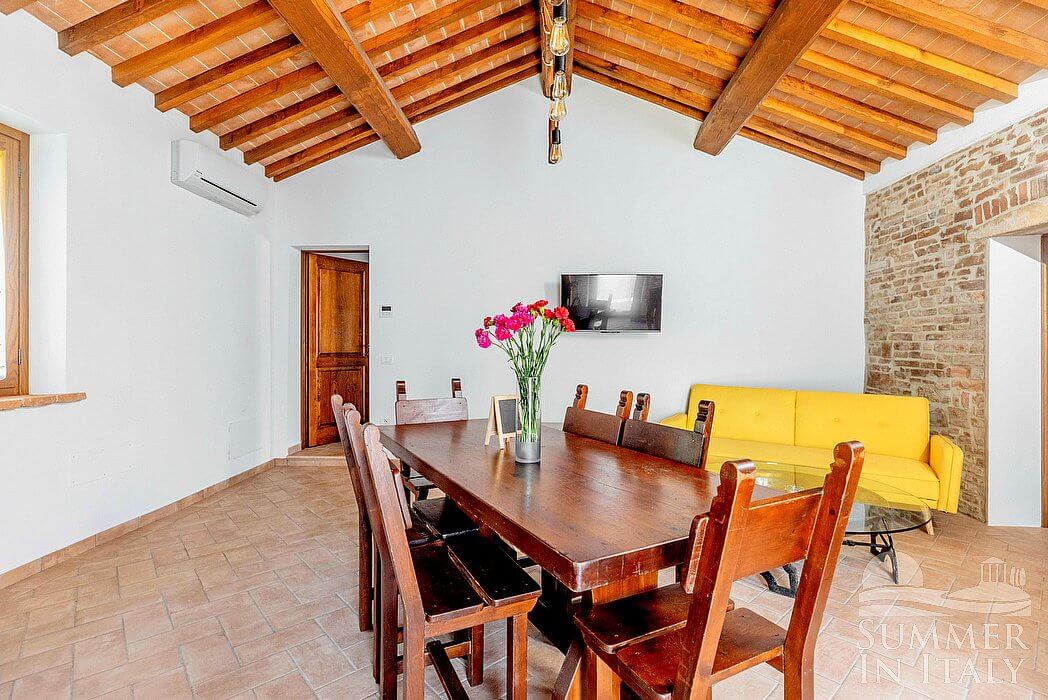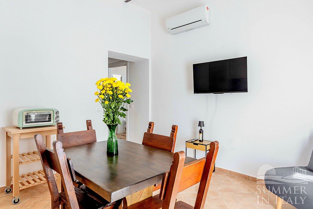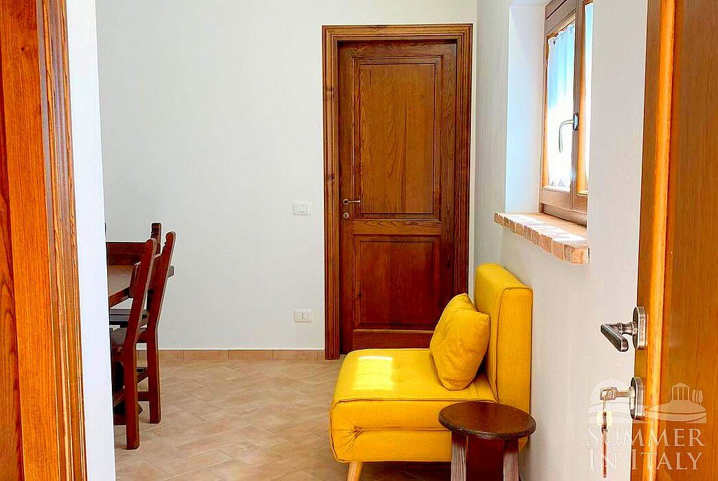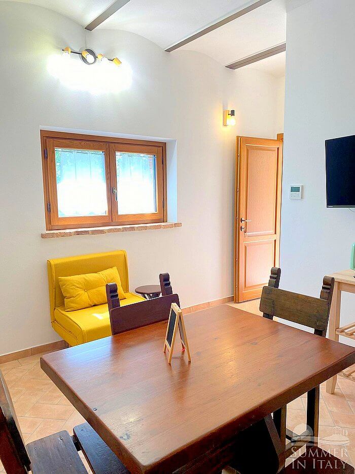 The living room is paved with terracotta tiles. The ceiling is sloped and has characteristic exposed wood beams and terracotta tiles. The furnishings are simple and comfortable, and include a sofa. There is a nice fireplace made of bricks. In the living room you will also find a cooking area. The kitchenette is equipped with a four-burner induction cooker, a small electric oven, a refrigerator with freezer, a dishwasher, an Italian-style coffee-maker, an American-style coffee-maker and a kettle. The dining table can accommodate six guests. In this room you will find a satellite television (local channels). The room has a window. It is equipped with an air conditioning/heating unit.