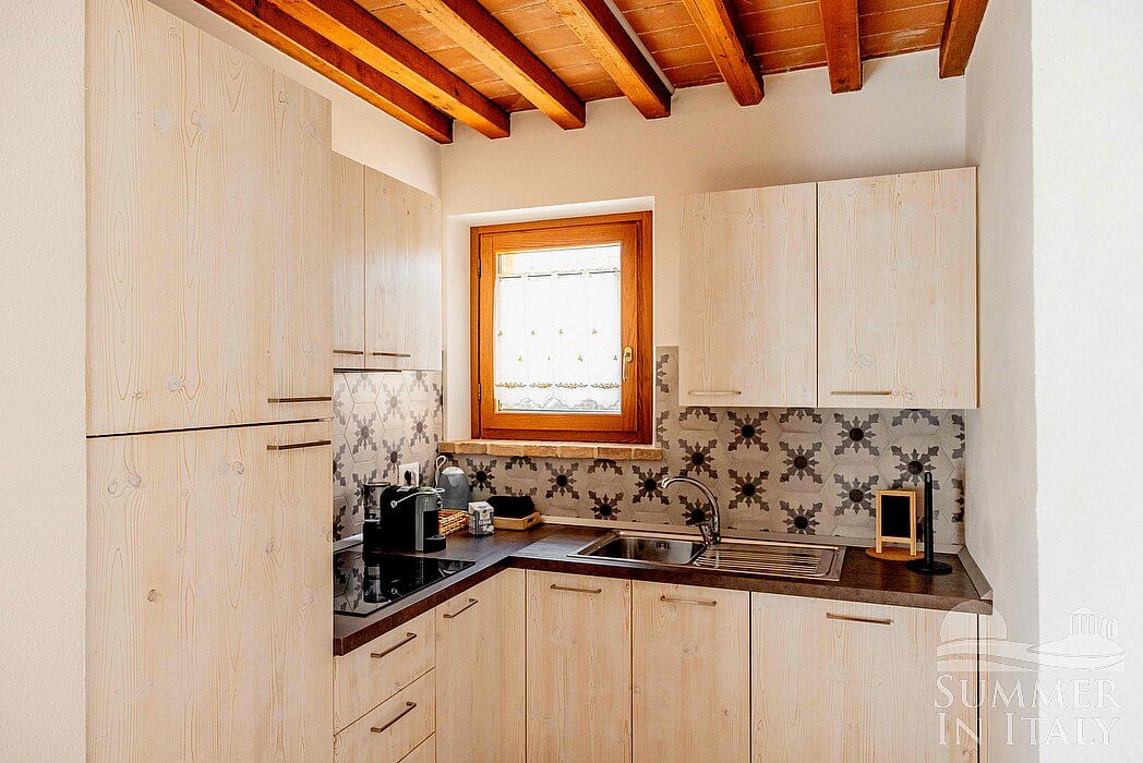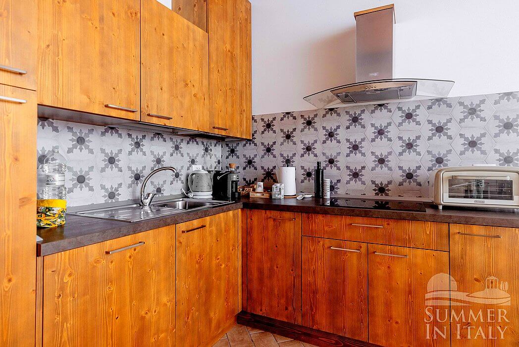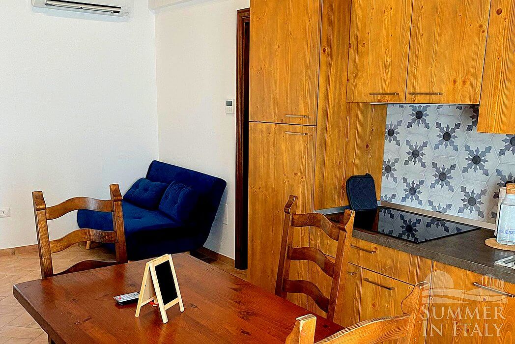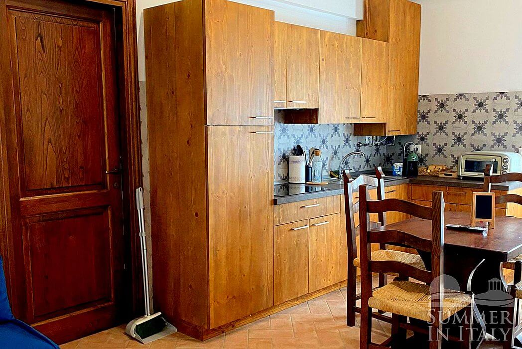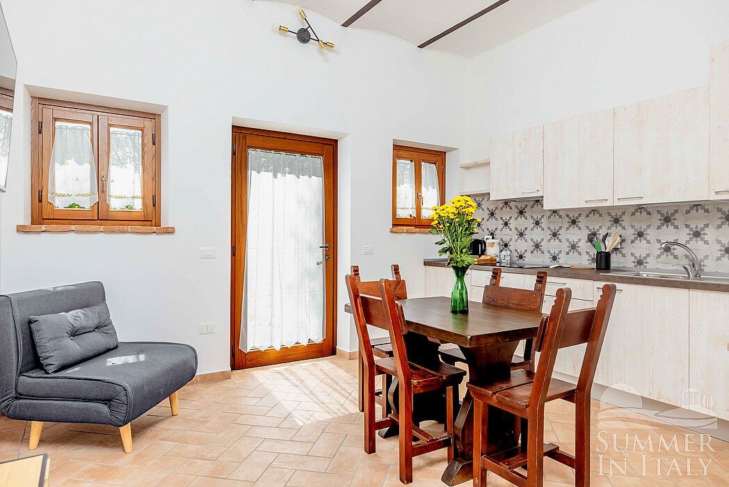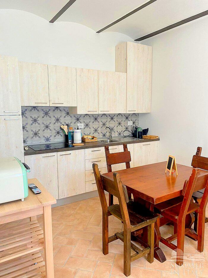 The first kitchen is paved with terracotta tiles. The ceiling is sloped and has characteristic exposed wood beams and terracotta tiles. The furnishings are simple and comfortable. It is equipped with a four-burner induction cooker, a small electric oven, a refrigerator with freezer, a dishwasher, an Italian-style coffee-maker, an American-style coffee-maker and a kettle. The dining table can accommodate four guests. The furnishings of the kitchen include a small sofa. The kitchen is also equipped with a satellite television (local channels). The kitchen has two windows, and is equipped with an air conditioning/heating unit.