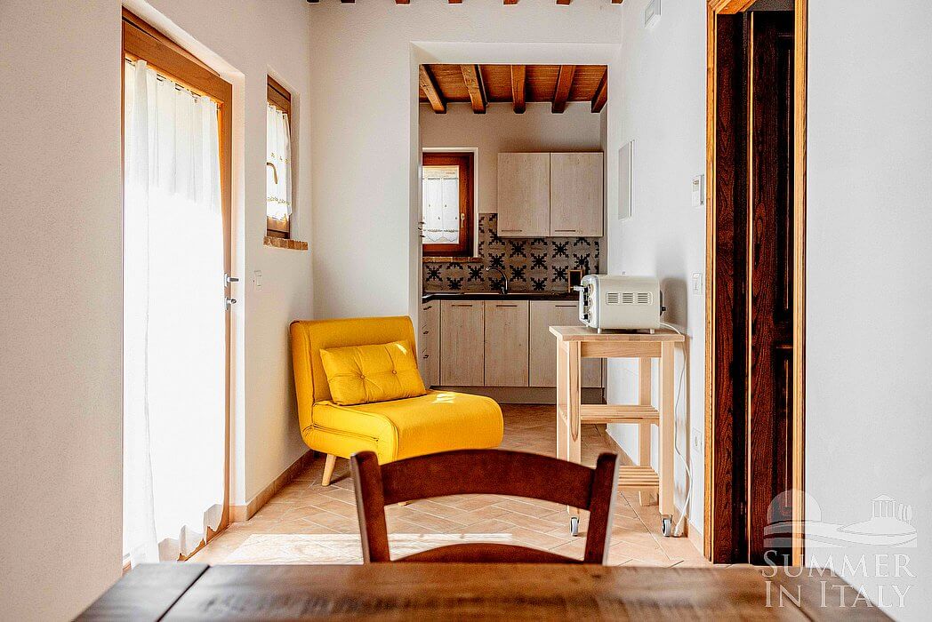 The second kitchen is paved with terracotta tiles. The ceiling has characteristic exposed wood beams and terracotta tiles. The furnishings are simple and comfortable. It is equipped with a four-burner induction cooker, a small electric oven, a refrigerator with freezer, a dishwasher, an Italian-style coffee-maker, an American-style coffee-maker and a kettle. The dining table can accommodate four guests. The furnishings of the kitchen include an armchair and a wood bench. The kitchen is also equipped with a satellite television (local channels). The kitchen has two windows, and is equipped with an air conditioning/heating unit.
