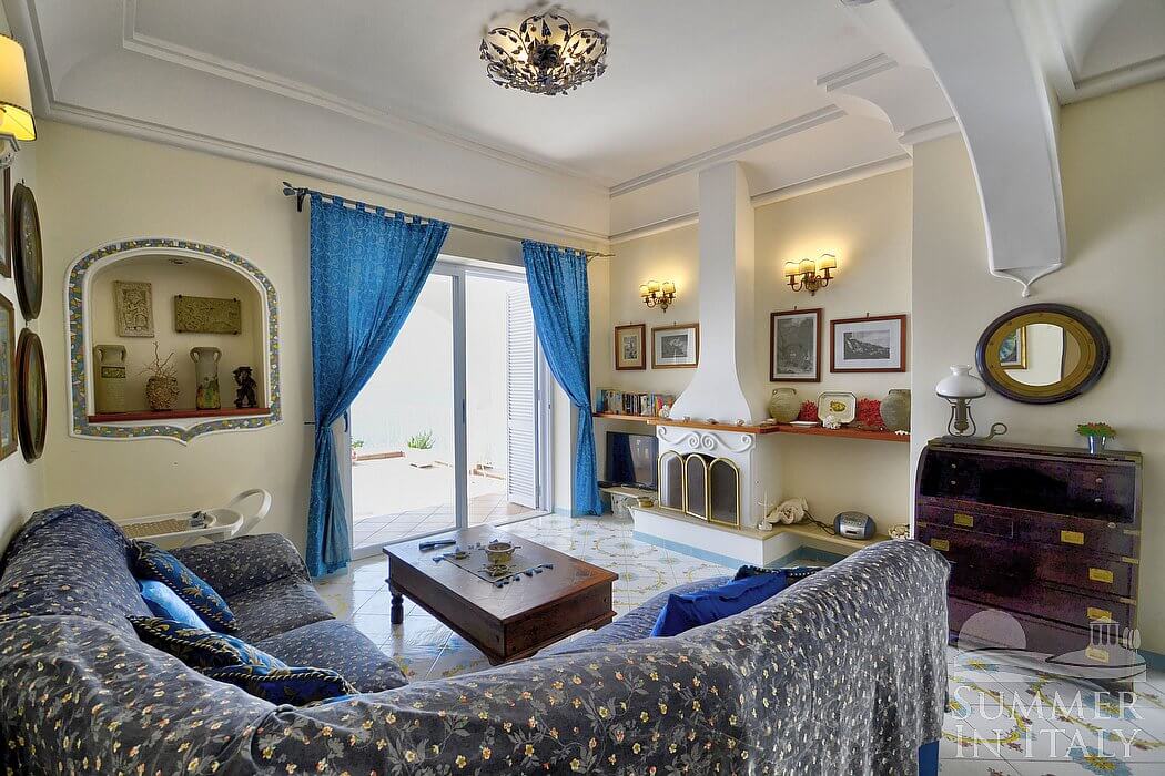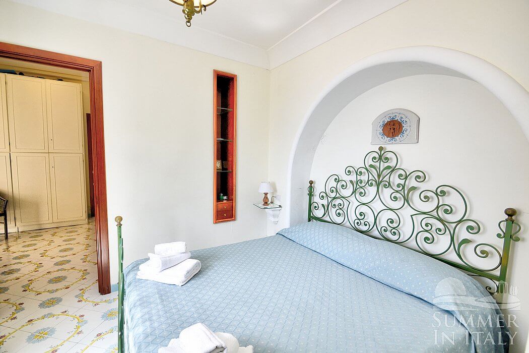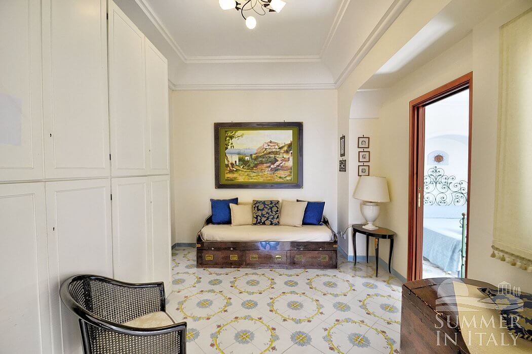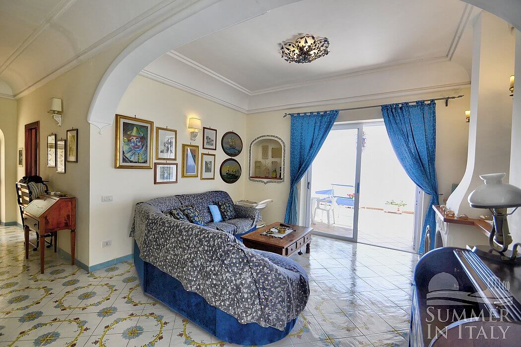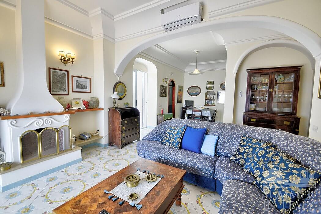 The living room is paved with handmade majolica tiles, in the characteristic style of the Amalfi Coast. The furnishings are elegant and refined. The furnishings include a long L-shaped sofa. There is an elegant fireplace, for decorative purposes only. In the living room you will also find a cooking area. The kitchenette is equipped with a four-burner gas cooker, an electric oven, a refrigerator with freezer, a dishwasher, a microwave oven, an Italian-style coffee-maker, an American-style coffee-maker (bring your filters!), a toaster and a kettle. The dining table can accommodate four guests. In this room you will find a satellite television (local channels), a DVD player and a CD player. From the living room you will be able to enter the first terrace with a view of the sea and of the coastline through two French doors. The room is equipped with an air conditioning/heating unit.