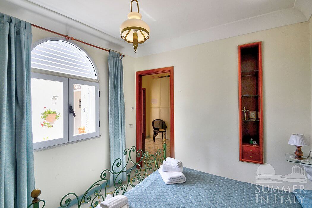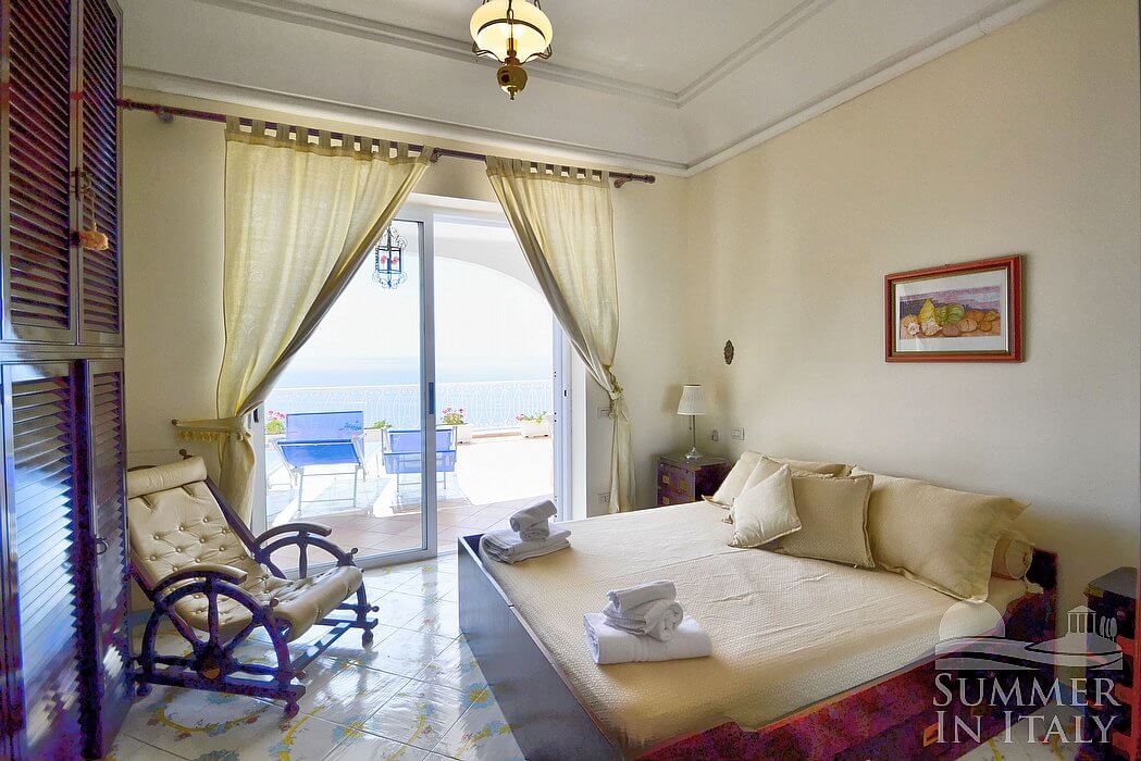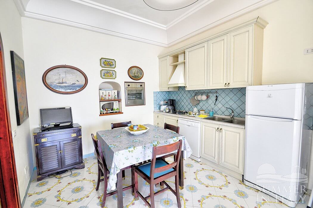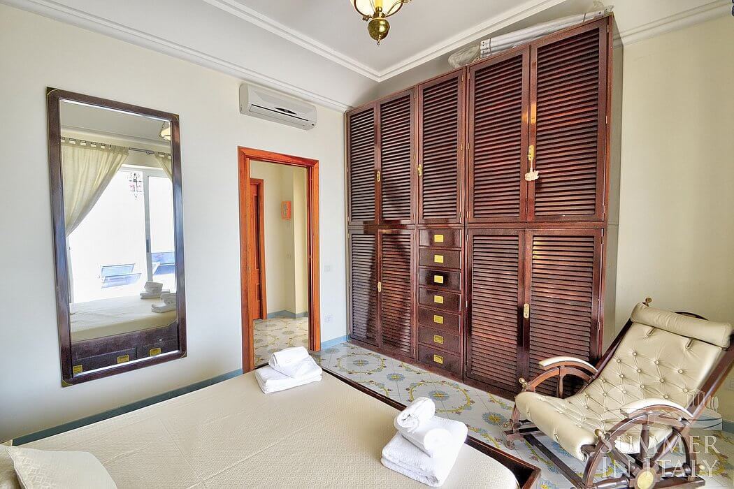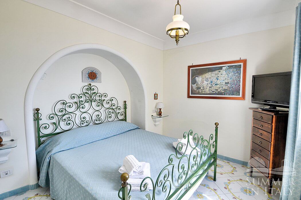 The living room is paved with handmade majolica tiles, in the characteristic style of the Amalfi Coast. The furnishings are elegant and refined. The furnishings include a long L-shaped sofa. There is an elegant fireplace, for decorative purposes only. In the living room you will also find a cooking area. The kitchenette is equipped with a four-burner gas cooker, an electric oven, a refrigerator with freezer, a dishwasher, a microwave oven, an Italian-style coffee-maker, an American-style coffee-maker (bring your filters!), a toaster and a kettle. The dining table can accommodate four guests. In this room you will find a satellite television (local channels), a DVD player and a CD player. From the living room you will be able to enter the first terrace with a view of the sea and of the coastline through two French doors. The room is equipped with an air conditioning/heating unit.