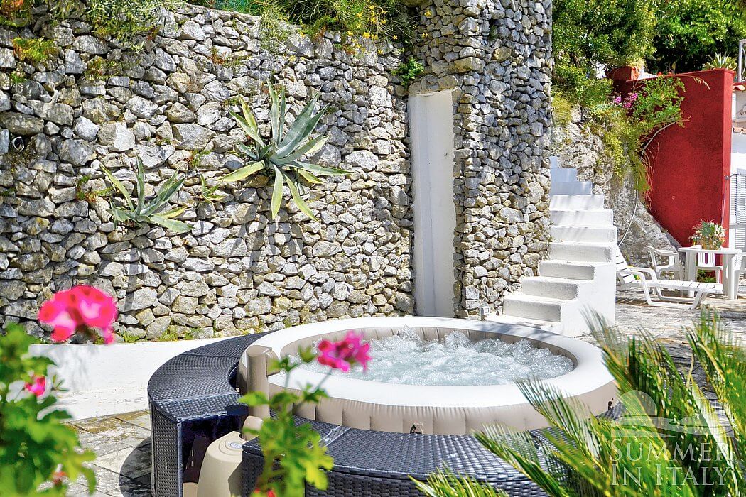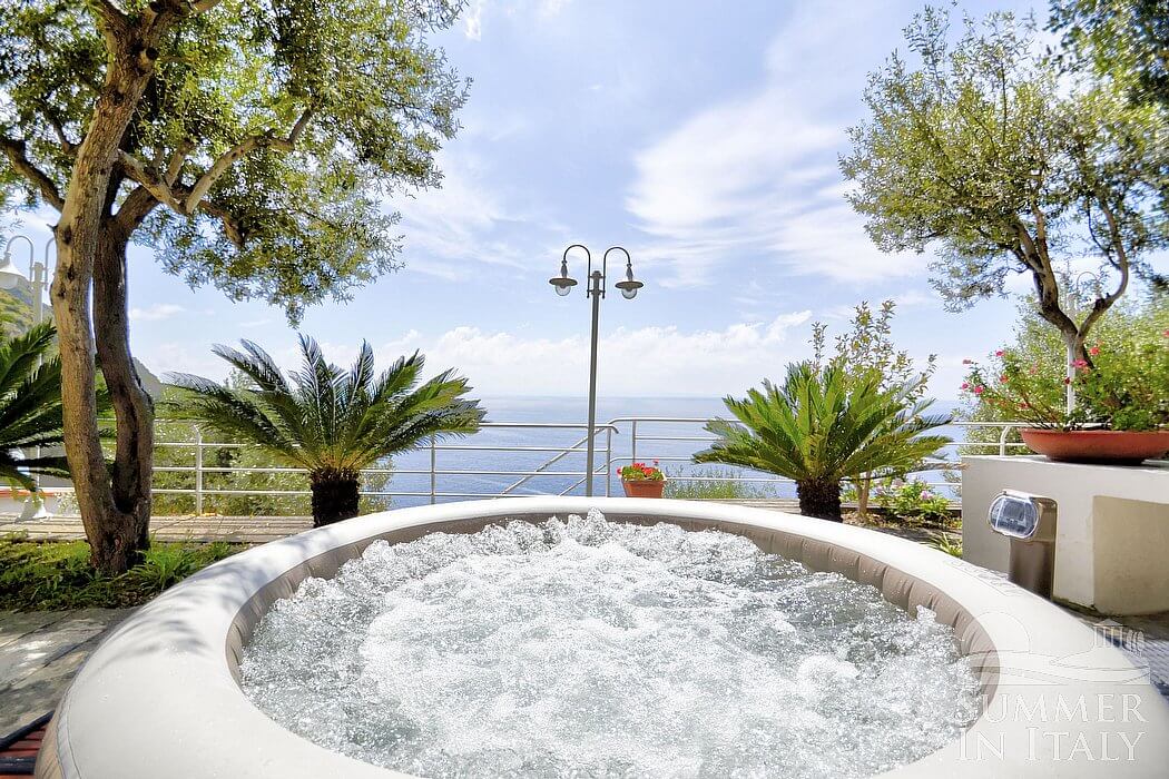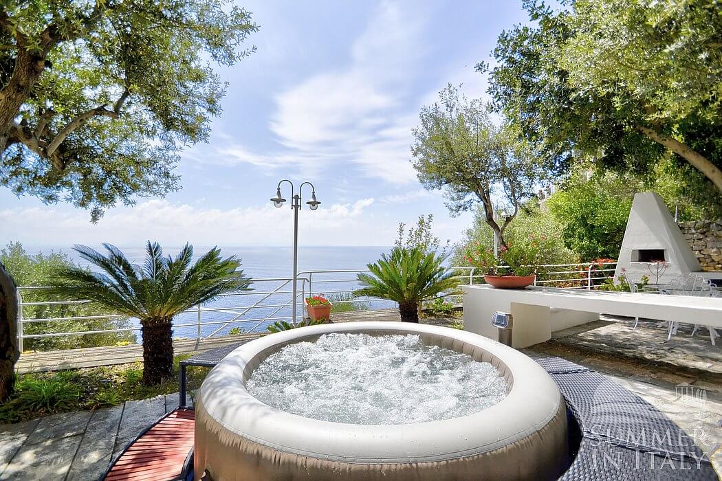 The second terrace is 60 square meters (645 square feet) large. It features an above-ground heated jacuzzi pool with hydromassage with four seats. The jacuzzi pool is open from the beginning of April until the end of October. It is partly shaded by trees. It is equipped with a table, chairs and an external shower. Here you will also find a wood-fired pizza oven. From the terrace you will enjoy a splendid view of the sea.