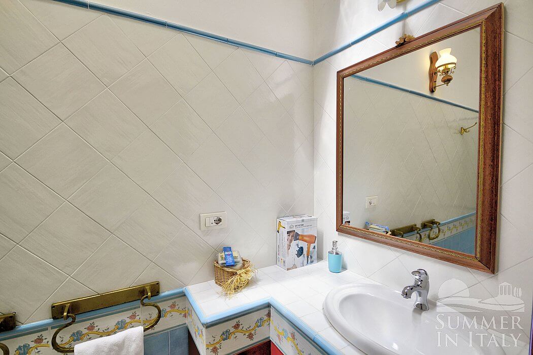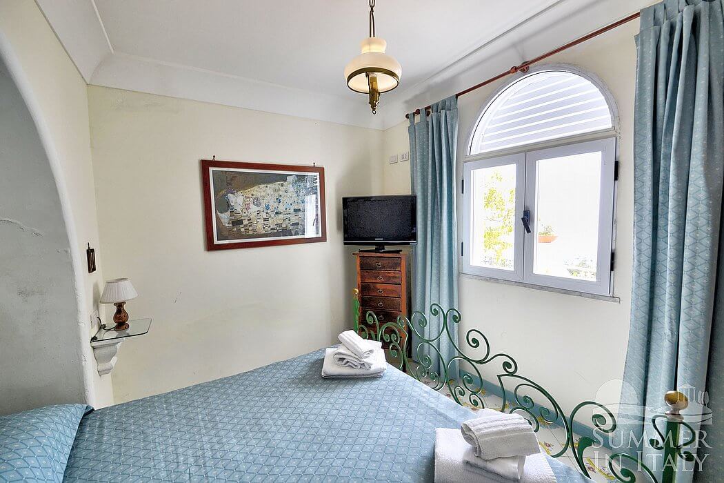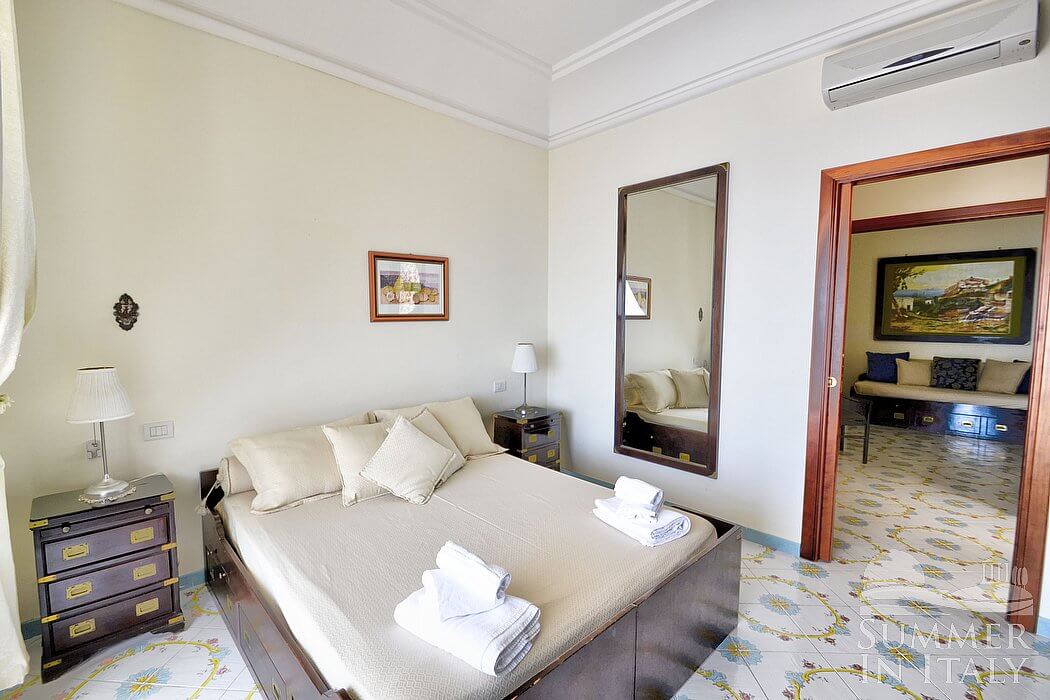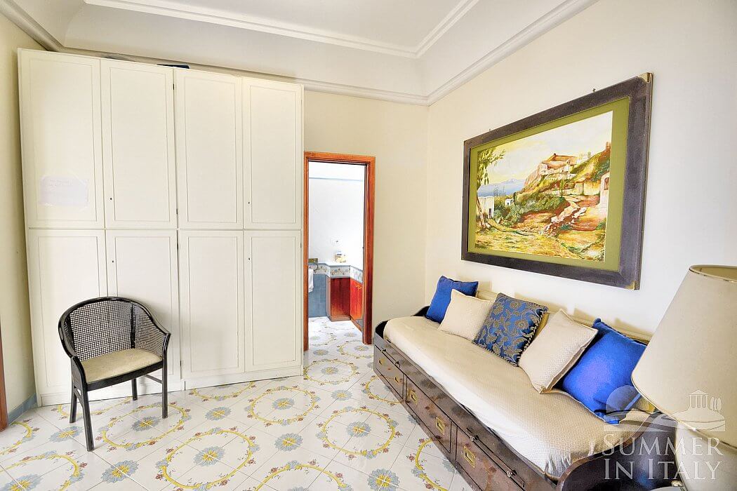This suite is made up by three interconnected rooms: a sleeping area, a sitting area and a bathroom. You will be able to enter the first bedroom through a corridor. The bedroom has a matrimonial bed (160 cm/63 inches, wider than a queen-size bed). The furnishings include two armchairs and a divan bed with a trundle bed to sleep two guests. In this room you will find a television (local channels). The room has a window with a view of the sea and of the terrace. The bedroom is equipped with an air conditioning/heating unit. This bedroom has an en-suite bathroom, tiled with lucid handmade majolica tiles and equipped with a washbasin, a toilet, a fully enclosed shower and a hairdryer.