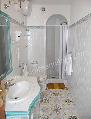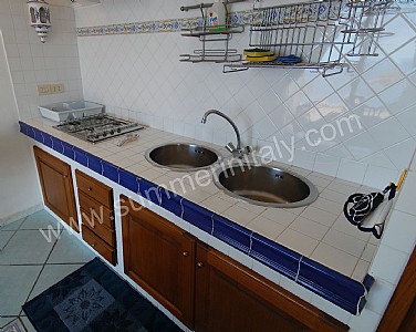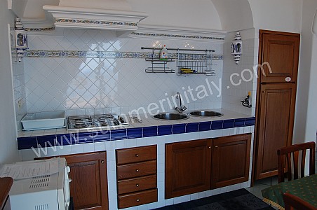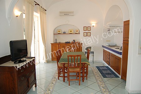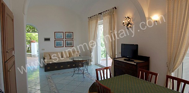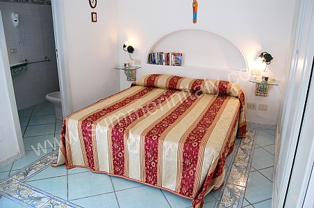 The living room is paved with handmade majolica tiles, in the characteristic style of the Amalfi Coast. The furnishings are elegant and welcoming. The furnishings include a divan bed with a trundle bed to sleep two guests. In the living room you will also find a cooking area. The kitchenette is equipped with a four-burner gas cooker, an electric oven, a refrigerator with freezer, a microwave oven and an Italian-style coffee-maker. The dining table can accommodate four guests. In this room you will find a satellite television (local channels). From the living room you will be able to enter the terrace with a view of the sea through two French doors. The room is equipped with an air conditioning/heating unit.
