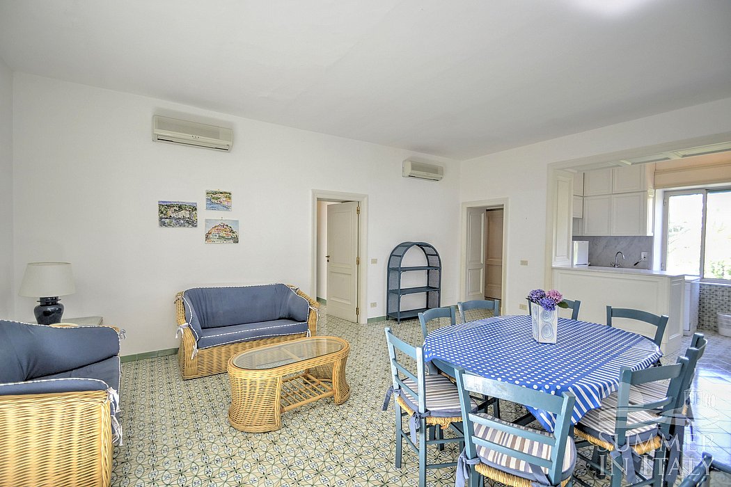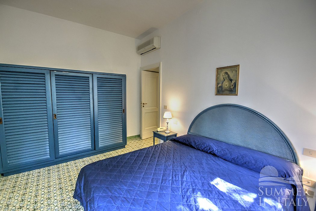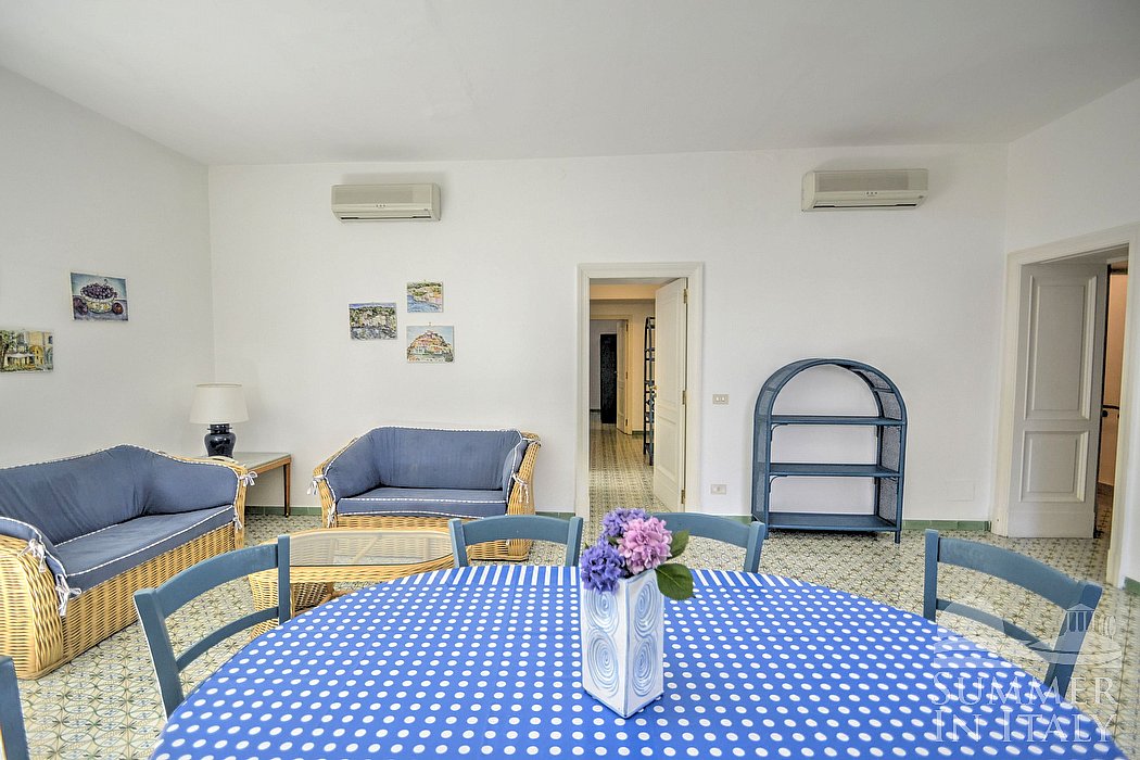 The living room is paved with handmade majolica tiles, in the characteristic style of the Amalfi Coast. The furnishings are bright and agreeable. The furnishings include two sofas and two armchairs. The dining table can accommodate six guests. In this room you will find a television (local channels). The room also has a window. The room has two Juliet balconies. It is equipped with an air conditioning/heating unit.