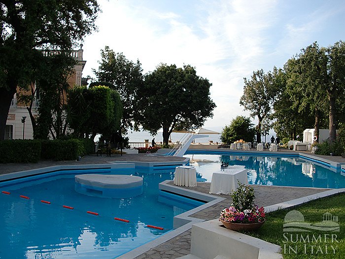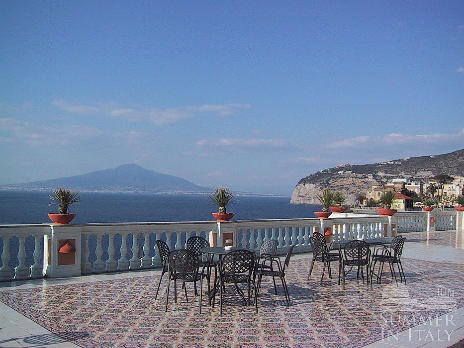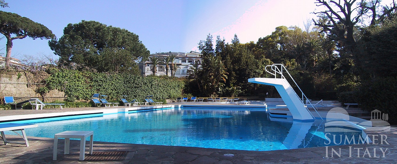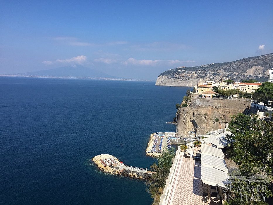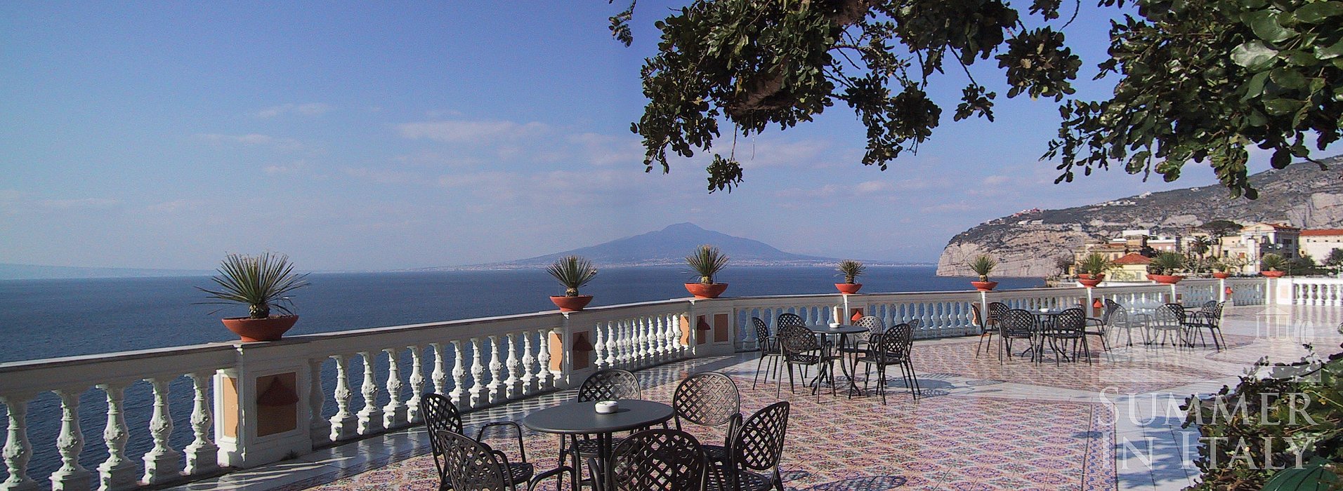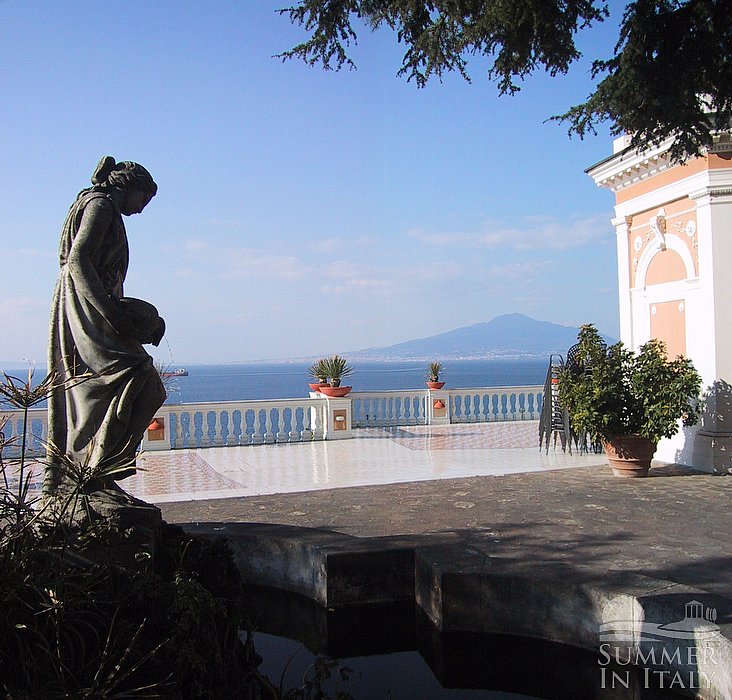 At the two ends of the terrace are two masterpieces of architecture: on one side, the ancient Bourbon building, on the other side, a modern luxury hotel designed by famous Italian architect Giò Ponti in the sixties. There is enough to start dreaming... you will spend your vacation surrounded by beautiful things, collected, over time, all in this space by people who have loved the natural beauty of these places, and who have been able to exalt it. You will be able to stroll along the fresh pathways of the garden during the hot hours of the day, enjoy the services of a luxury hotel and relax by the beautiful swimming pool, go to the sea, if you want, always with the sight of one of the world's most beautiful seascapes in front of you. And when the sun sets, on the terrace by the sea a romantic piano bar opens: you will be able to end your day with the show of the light of the gulf of Naples, sitting at the bar and listening to the sweet words of "Torna a Surriento".