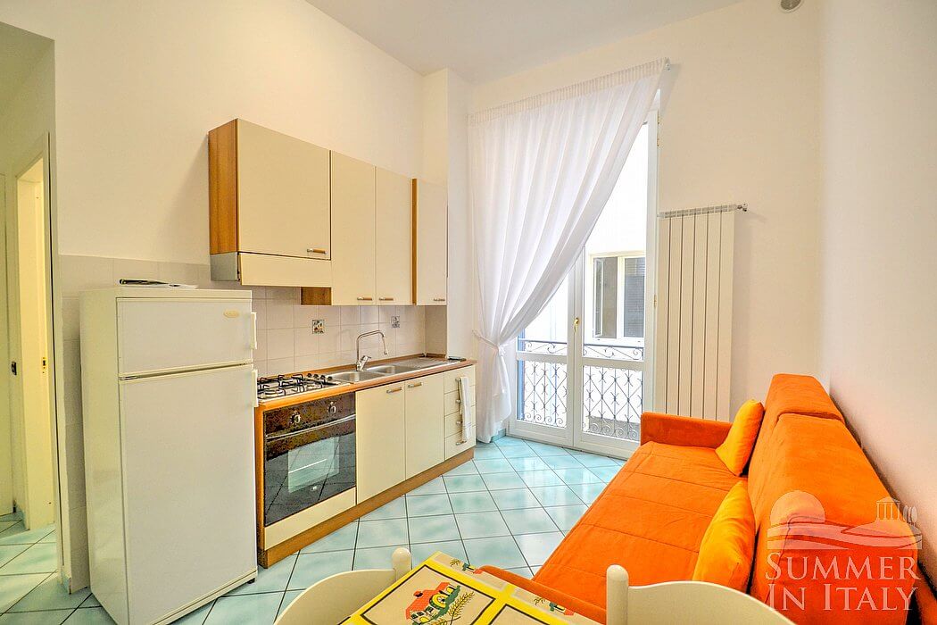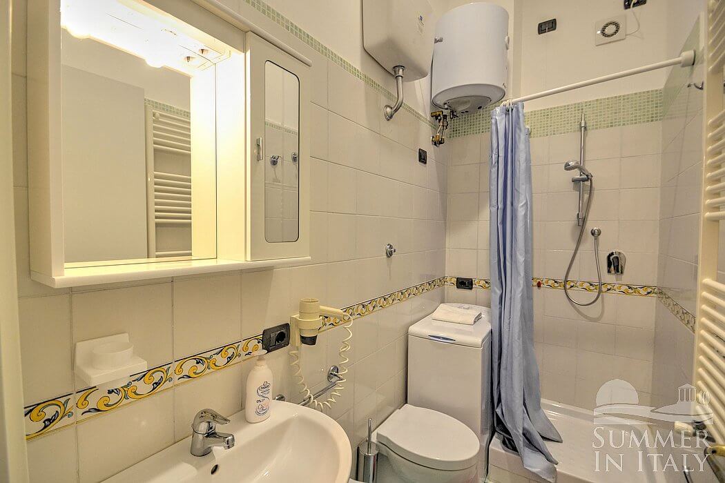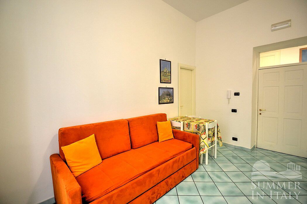 The living room is paved with bright sea green majolica tiles. The furnishings are simple and comfortable. The furnishings include a divan that unfolds into a double bed. In the living room you will also find a cooking area. The kitchenette is equipped with a four-burner gas cooker, a refrigerator with freezer, a microwave oven, an Italian-style coffee-maker and other small appliances. The dining table can accommodate four guests. In this room you will find a television (local channels). From the living room you will be able to enter the small balcony through a French door. The room is equipped with an air conditioning/heating unit.