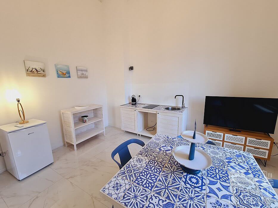 The living room is paved with marble. The furnishings are simple, and include a divan that unfolds into a double bed. In the living room you will also find a cooking area. The kitchenette is equipped with a two-burner induction cooker, a small refrigerator without freezer and an Italian-style coffee-maker. The dining table can accommodate four guests. In this room you will find a satellite television (local channels). The room has a large window. It is equipped with an air conditioning/heating unit.