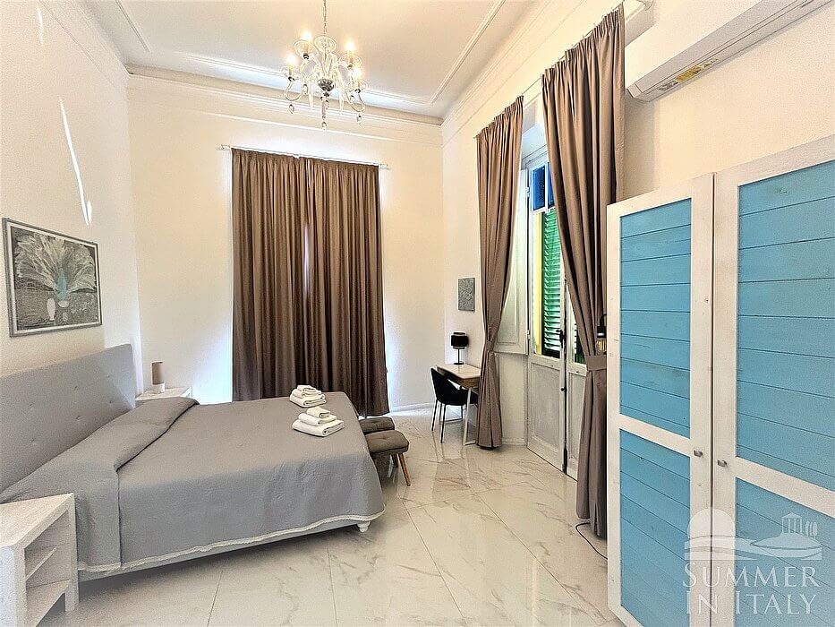 You will be able to enter the bedroom from the living room through a cased opening. This room has no door. The bedroom has a matrimonial bed (160 cm/63 inches, wider than a queen-size bed). The furnishings include an armchair and a desk. From the bedroom you will be able to enter a balcony through two French doors. The bedroom is equipped with an air conditioning/heating unit. This bedroom has an en-suite bathroom, made of marble and equipped with a washbasin, a toilet, a fully enclosed shower and a hairdryer.