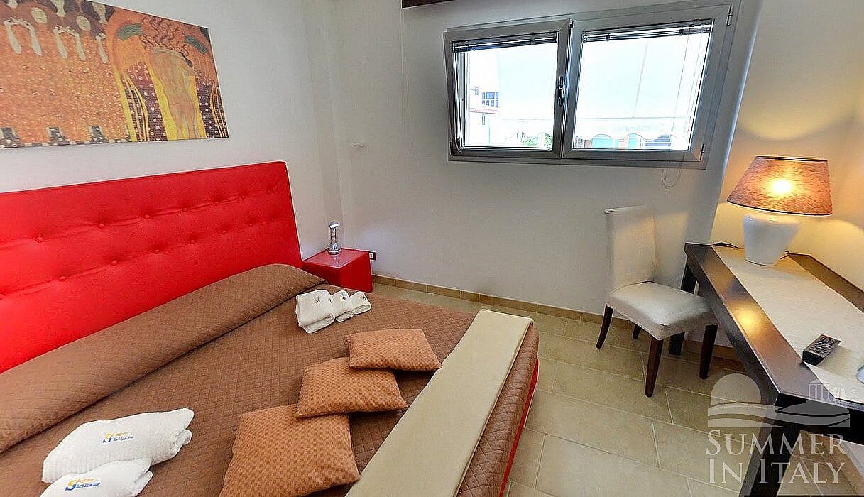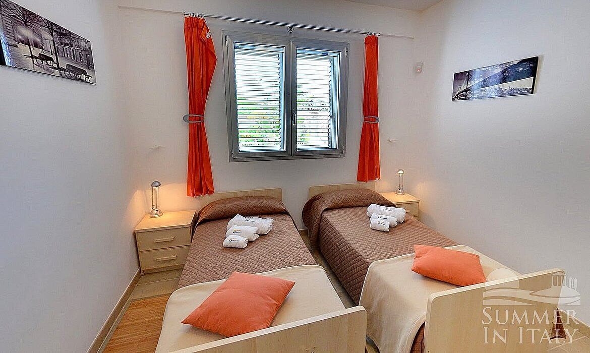 The furnishings of the living room are simple and comfortable. The furnishings include a sofa. In the living room you will also find a cooking area. The kitchenette is equipped with a four-burner gas cooker, an electric oven, a refrigerator with freezer, a microwave oven, an Italian-style coffee-maker and a kettle. The dining table can accommodate four guests. In this room you will find a satellite television (local channels). From the living room you will be able to enter the terrace and the verandah through two double-glazed French doors. The room is equipped with an air conditioning/heating unit.