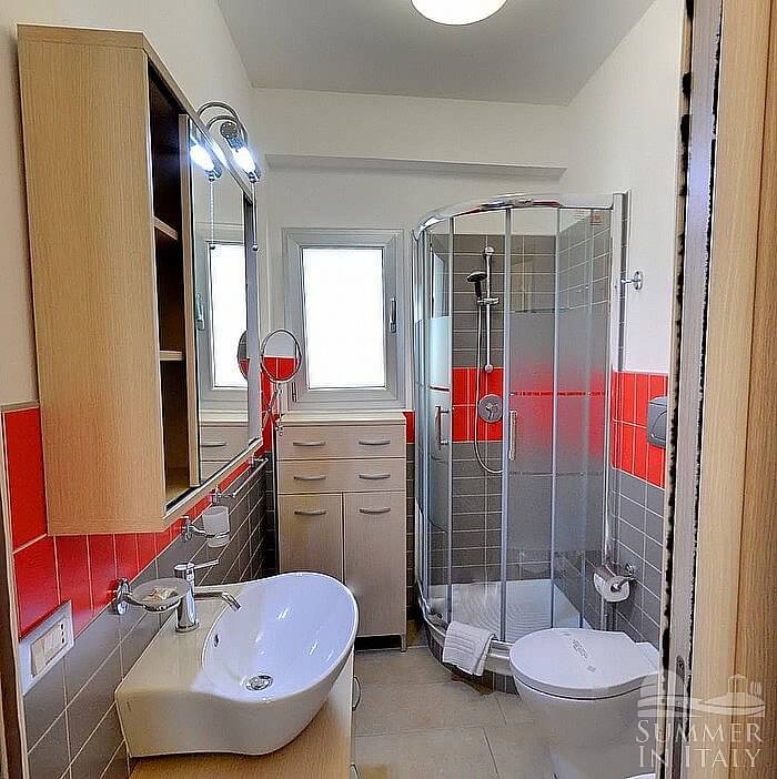 Appartamento Odisseo D is located on the ground floor of a two story building. You will reach it from the street level going up an external stairway which consists of approximately four steps.