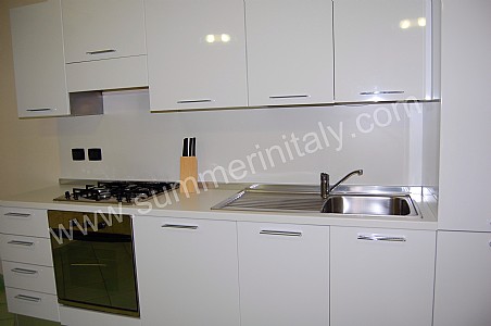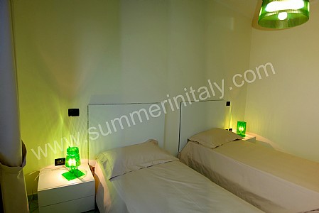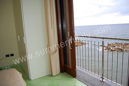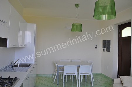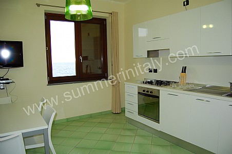 The furnishings of the living room are modern and welcoming. The furnishings include a divan that unfolds into a double bed. In the living room you will also find a cooking area. The kitchenette is equipped with a four-burner gas cooker, an electric oven, a refrigerator with freezer, a dishwasher and an Italian-style coffee-maker. The dining table can accommodate six guests. In this room you will find a satellite television (local channels). From the living room you will be able to enter the terrace through a French door. The room has a window with a view of the sea. It is equipped with an air conditioning/heating unit.