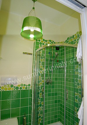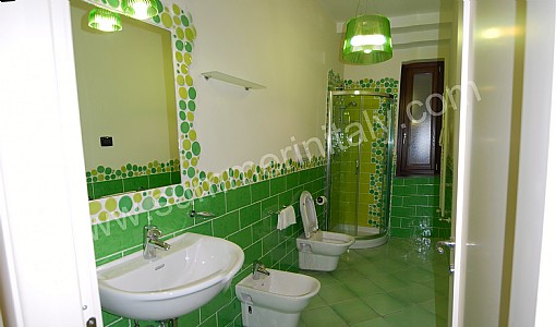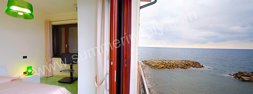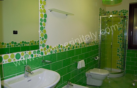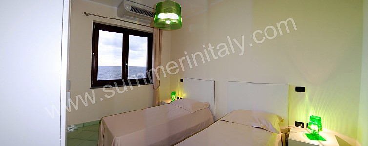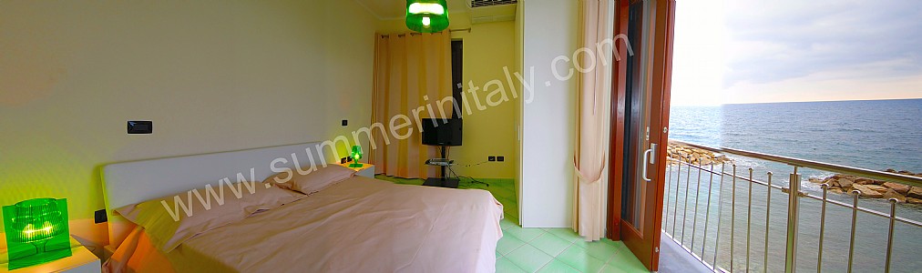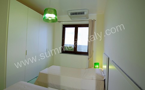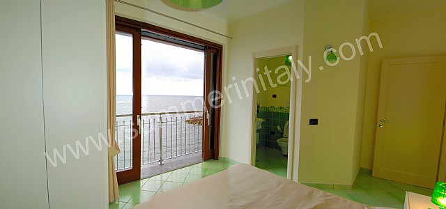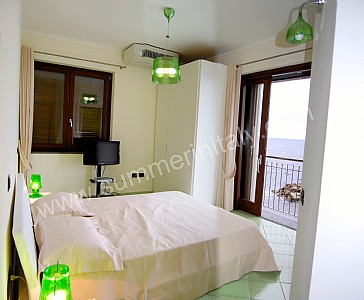 You will be able to enter the first bedroom from the corridor. The bedroom has a matrimonial bed (160 cm/62 inches, wider than a queen-size bed). In this room you will find a satellite television (local channels). From the bedroom you will be able to enter the small balcony with a view of the sea and of the coastline through a French door. The room has a window with a view of the sea. The bedroom is equipped with an air conditioning/heating unit. This bedroom has an en-suite bathroom, tiled with lucid handmade majolica tiles and equipped with a washbasin, a toilet, a fully enclosed shower and a hairdryer.