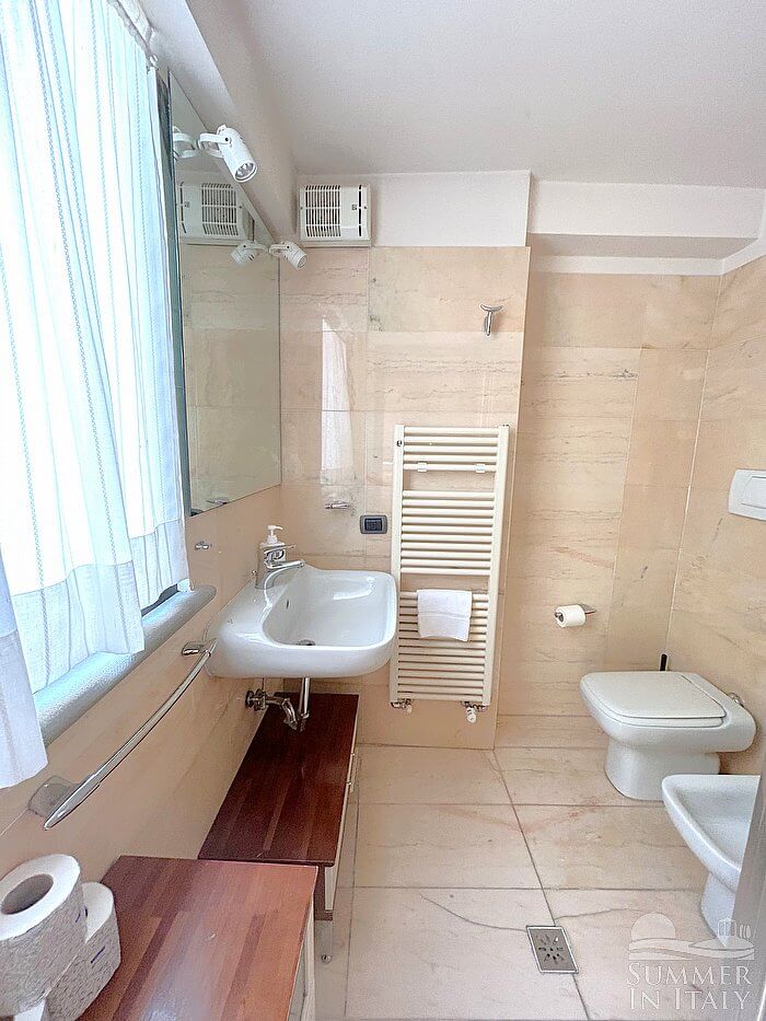 The living room is paved with terracotta tiles. The furnishings are warm and welcoming, and include a divan that unfolds into a double bed. In the living room you will also find a cooking area. The kitchenette is equipped with a four-burner gas cooker, an electric oven, a small refrigerator without freezer and an Italian-style coffee-maker. The dining table can accommodate four guests. In this room you will find a satellite television (local channels). The room has two windows. It is equipped with an air conditioning/heating unit.
