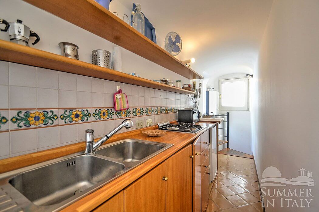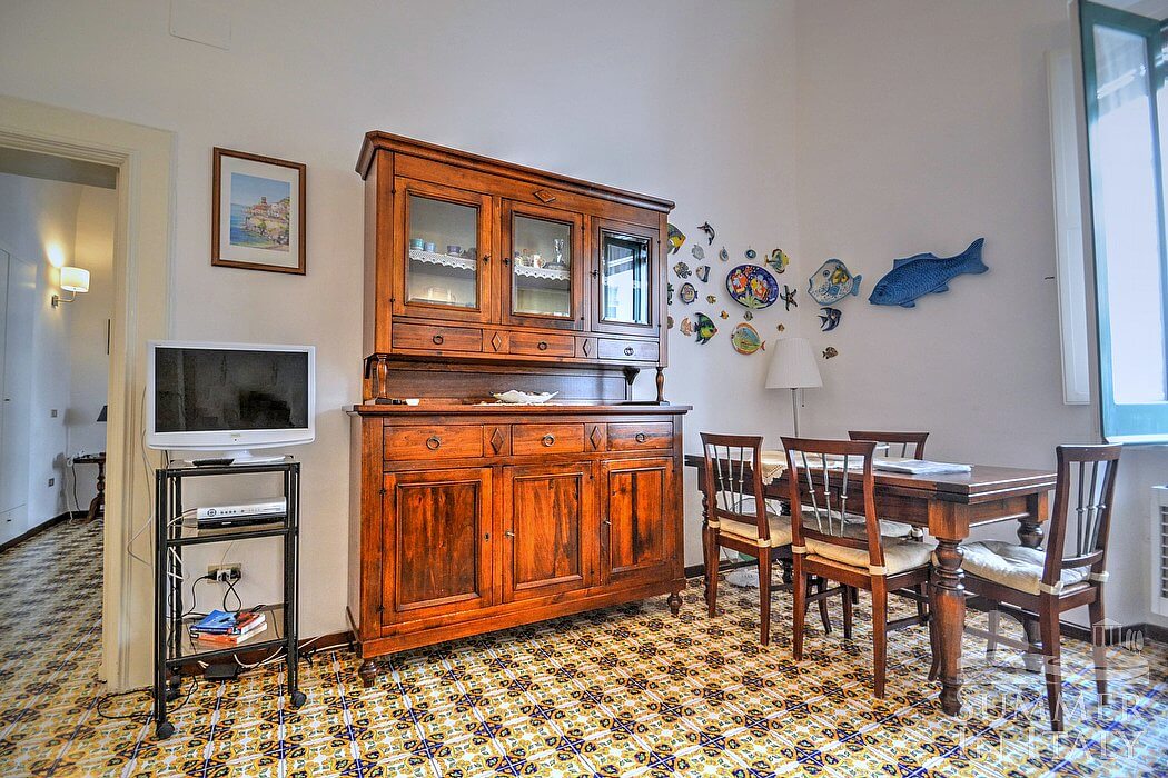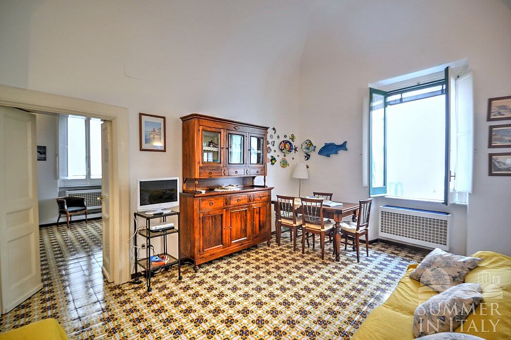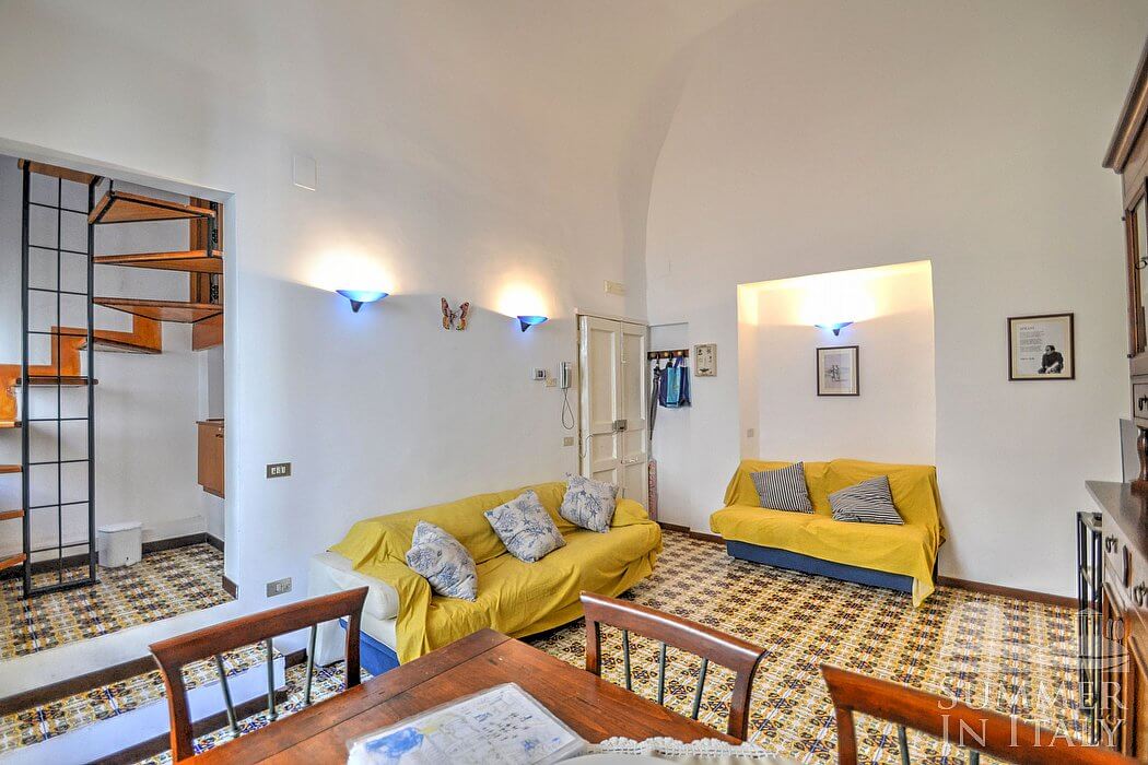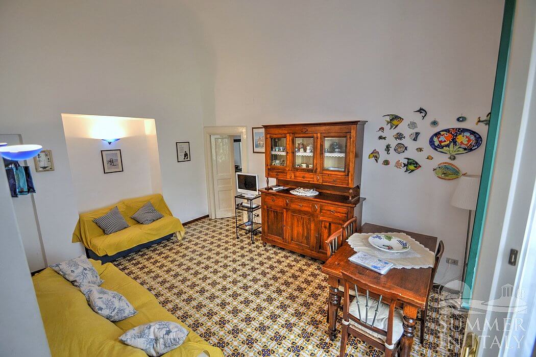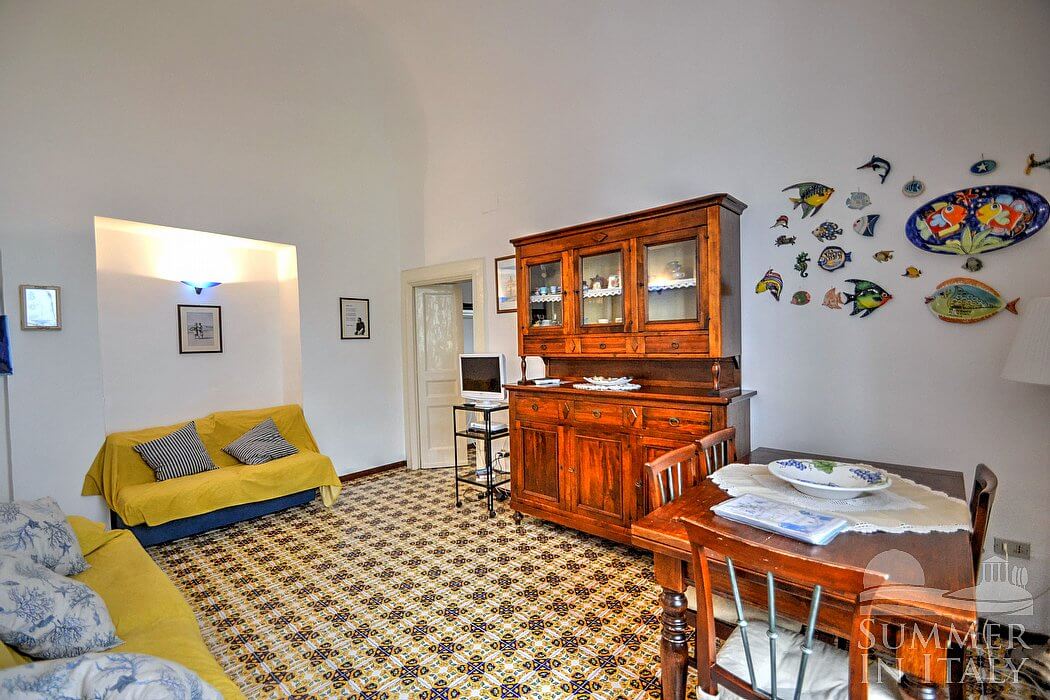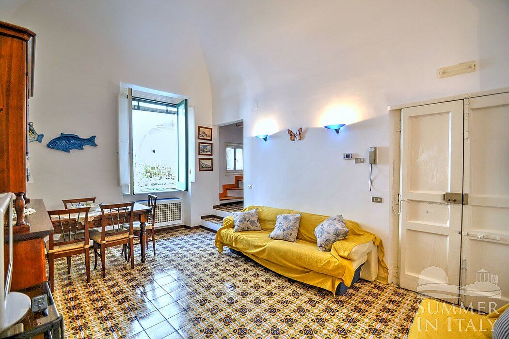 The living room is paved with majolica tiles with handmade decoration, in the characteristic style of the Amalfi Coast. The ceiling is high and vaulted. The furnishings are elegant. The furnishings include two sofas. The dining table can accommodate eight guests. In this room you will find a flat-screen satellite television (local channels). The room has a window.