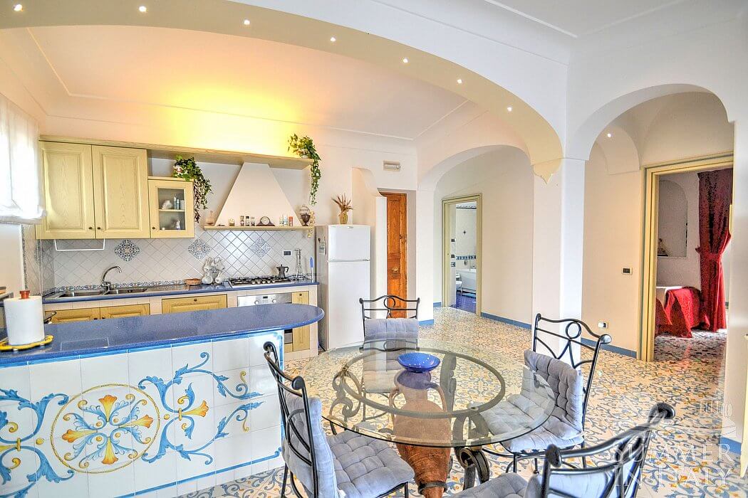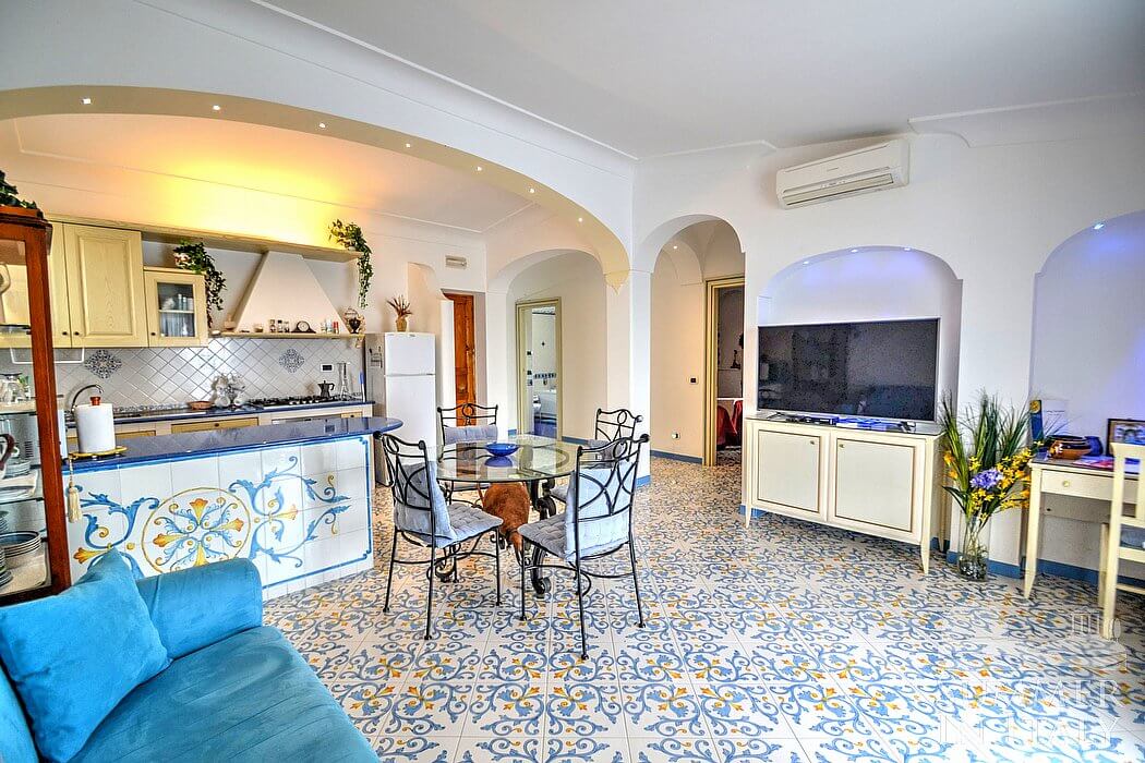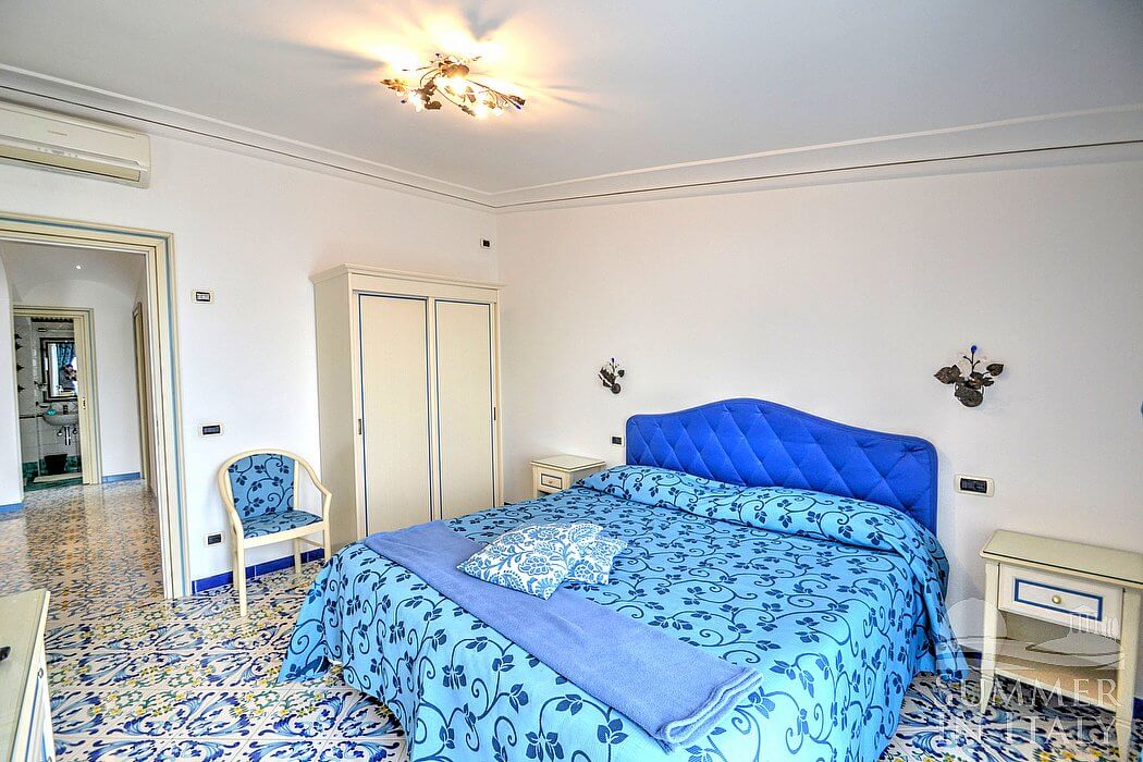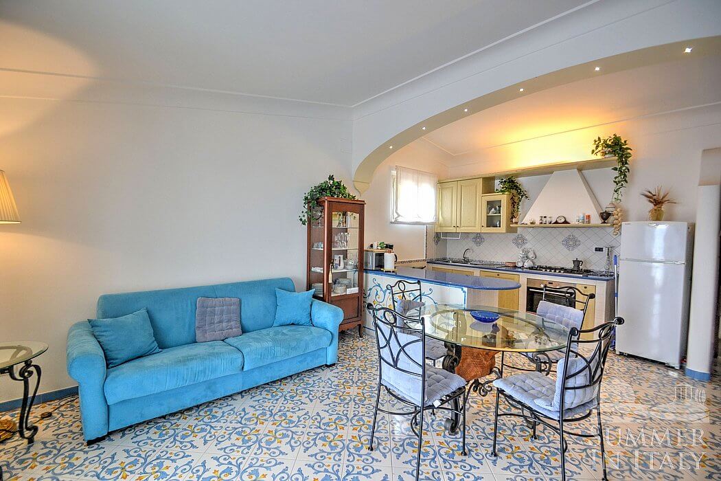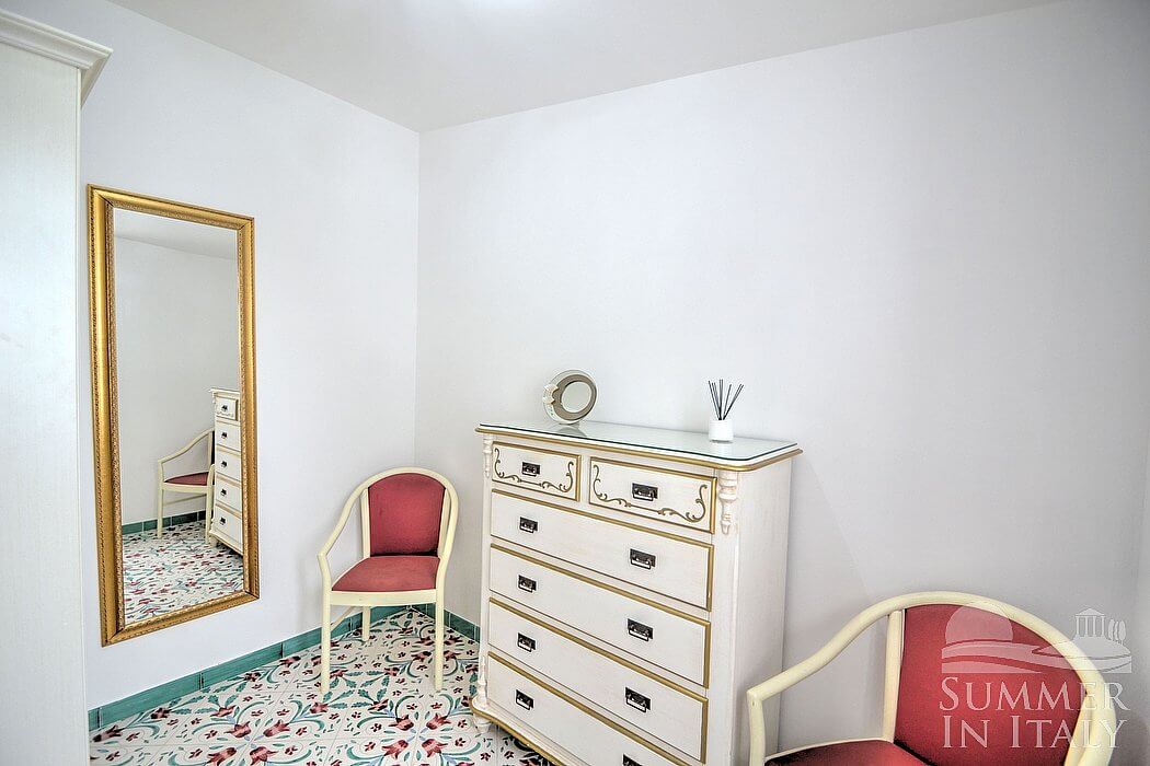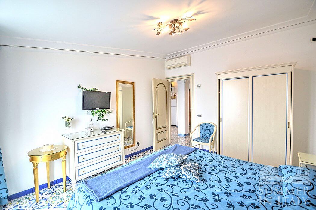 The living room is paved with handmade tiles, in the characteristic style of the Amalfi Coast. The furnishings are elegant and bright. The furnishings include a sofa and a desk. In the living room you will also find a cooking area. The kitchenette is spacious and comfortable, equipped with a five-burner gas cooker, an electric oven, a refrigerator with freezer, a dishwasher, a microwave oven, an Italian-style coffee-maker, an American-style coffee-maker (bring your filters!), a toaster and a kettle. There is also a washing machine, an iron and an ironing board. The dining table can accommodate four guests. In this room you will find a large flat-screen satellite television (local channels) and a DVD player. From the living room you will be able to enter the terrace with a view of the sea and of the coast of Amalfi through a French door. The room is equipped with an air conditioning/heating unit.