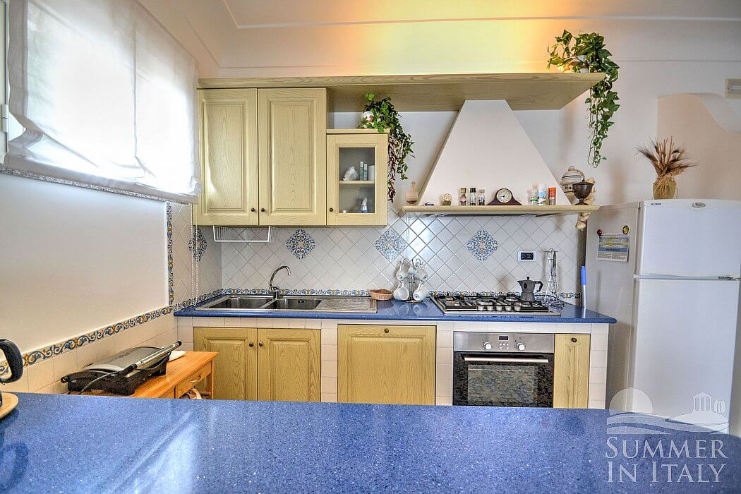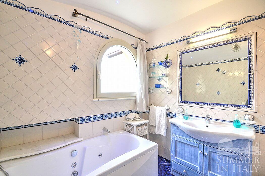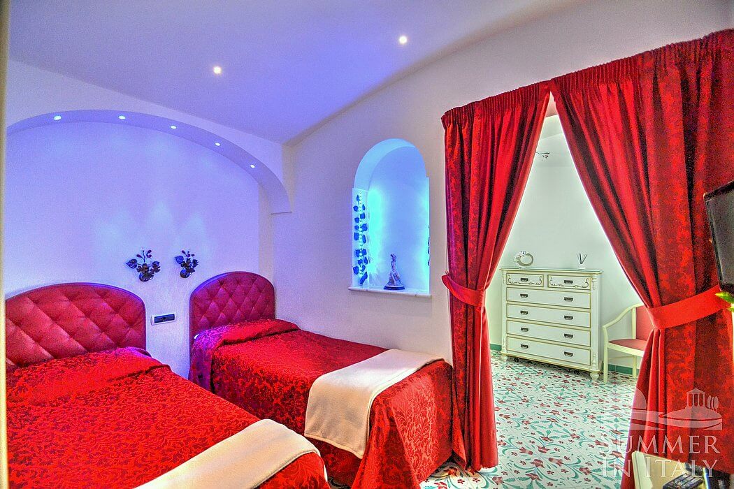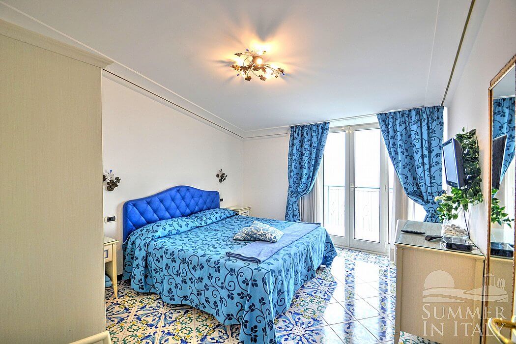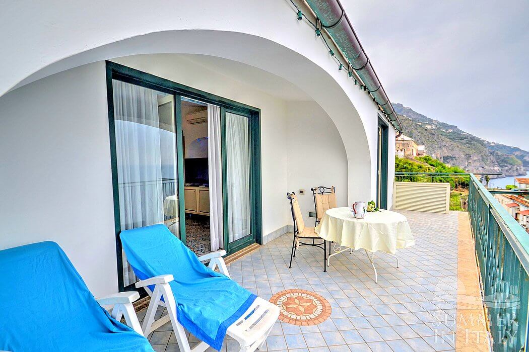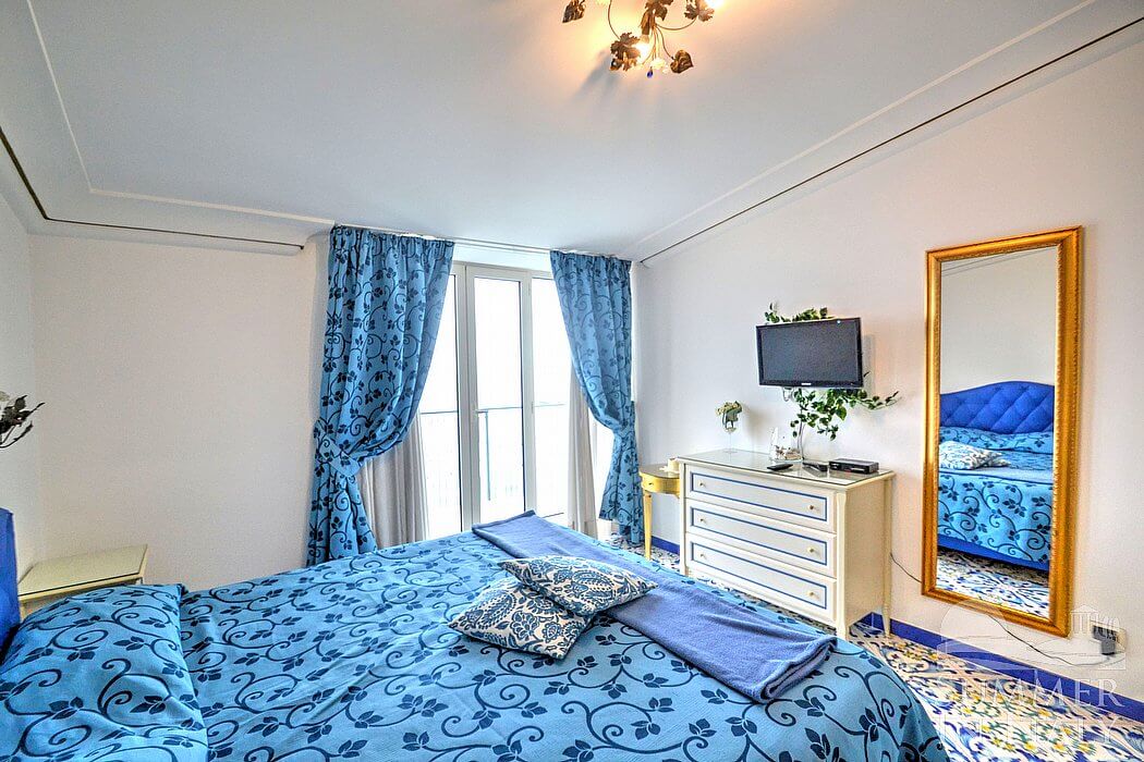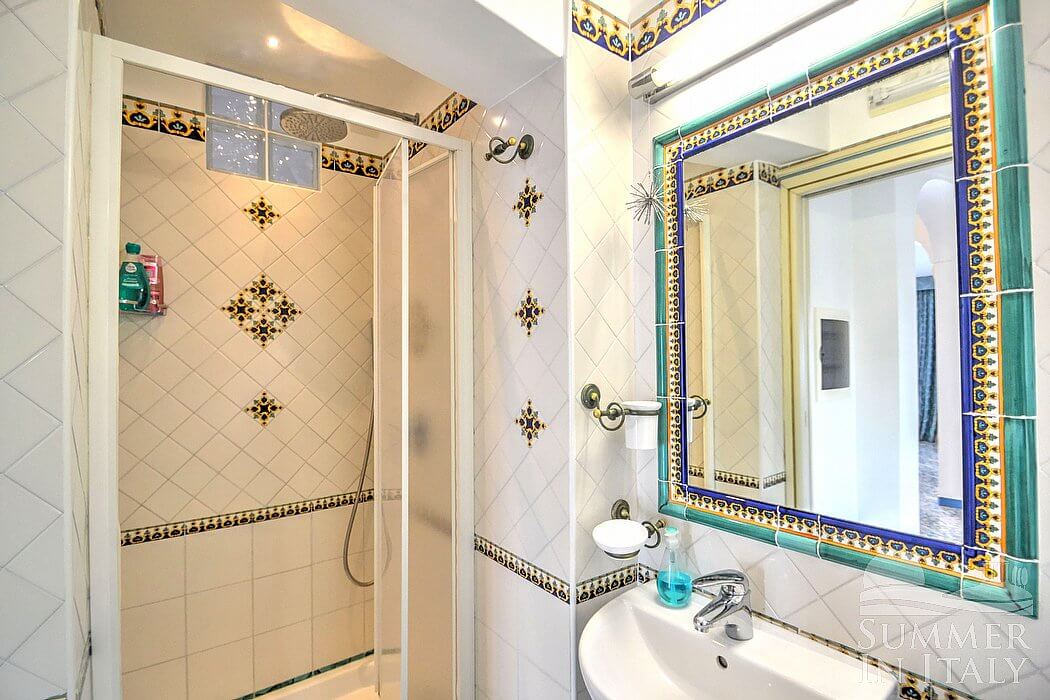 The living room is paved with handmade tiles, in the characteristic style of the Amalfi Coast. The furnishings are elegant and bright. The furnishings include a sofa and a desk. In the living room you will also find a cooking area. The kitchenette is spacious and comfortable, equipped with a five-burner gas cooker, an electric oven, a refrigerator with freezer, a dishwasher, a microwave oven, an Italian-style coffee-maker, an American-style coffee-maker (bring your filters!), a toaster and a kettle. There is also a washing machine, an iron and an ironing board. The dining table can accommodate four guests. In this room you will find a large flat-screen satellite television (local channels) and a DVD player. From the living room you will be able to enter the terrace with a view of the sea and of the coast of Amalfi through a French door. The room is equipped with an air conditioning/heating unit.