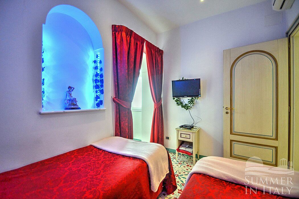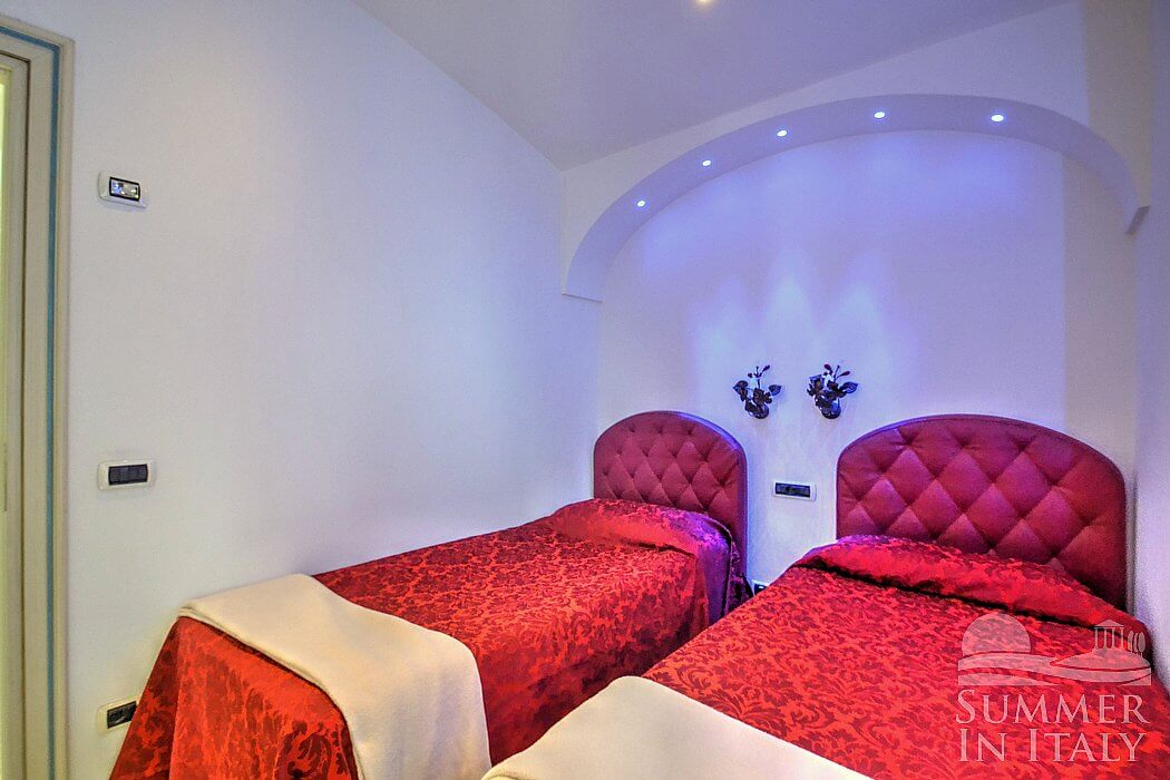 You will be able to enter the second bedroom from the corridor. It has two twin beds (80 cm/32 inches), that can be pushed together into a matrimonial bed if requested (please contact our staff in advance to make arrangements). In this room you will find a flat-screen satellite television (local channels). The room has a small window with a view of the countryside and a side view of the sea. The bedroom is equipped with an air conditioning/heating unit.