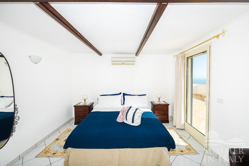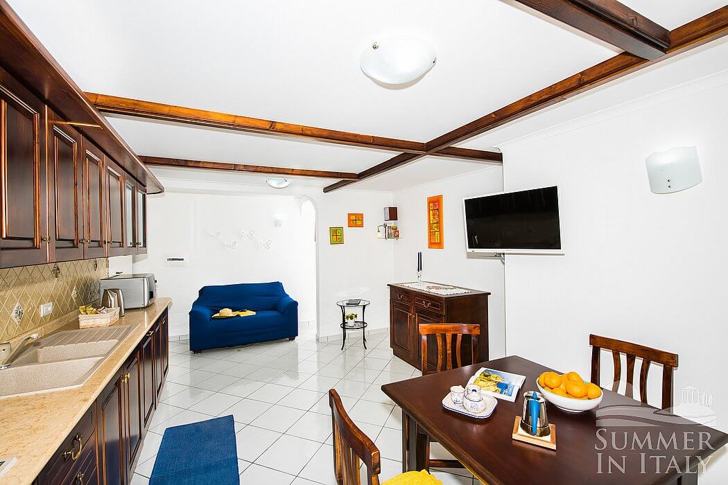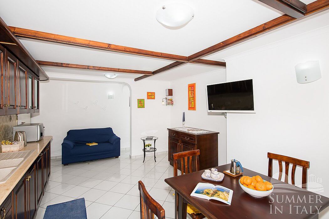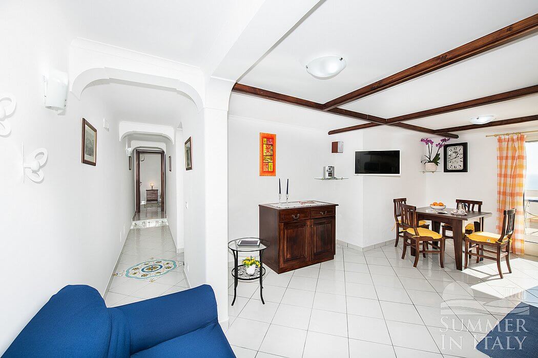 The living room is paved with handmade tiles, in the characteristic style of the Amalfi Coast. The furnishings are warm and welcoming. The furnishings include a sofa. In the living room you will also find a cooking area. The kitchenette is equipped with a five-burner gas cooker, a gas oven, a refrigerator with freezer, a dishwasher, a microwave oven, an Italian-style coffee-maker, an American-style coffee-maker (bring your filters!), a toaster and a kettle. The dining table can accommodate four guests. In this room you will find a flat-screen satellite television (local channels), a DVD player and a CD player with FM radio. From the living room you will be able to enter the terrace with a view of the sea and of the coast of Amalfi through a double-glazed French door.