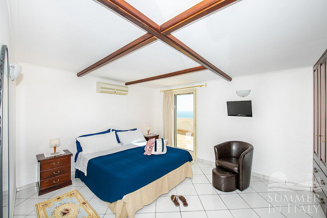 You will be able to enter the first bedroom from the corridor. The bedroom has a matrimonial bed (160 cm/62 inches, wider than a queen-size bed). The furnishings include a bedroom chair. In this room you will find a television (local channels). From the bedroom you will be able to enter the terrace with a view of the sea through a double-glazed French door. The bedroom is equipped with an air conditioning/heating unit. Here you will also find a safe.