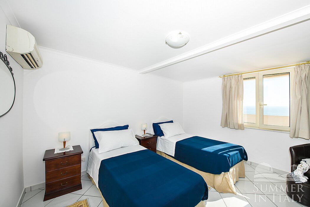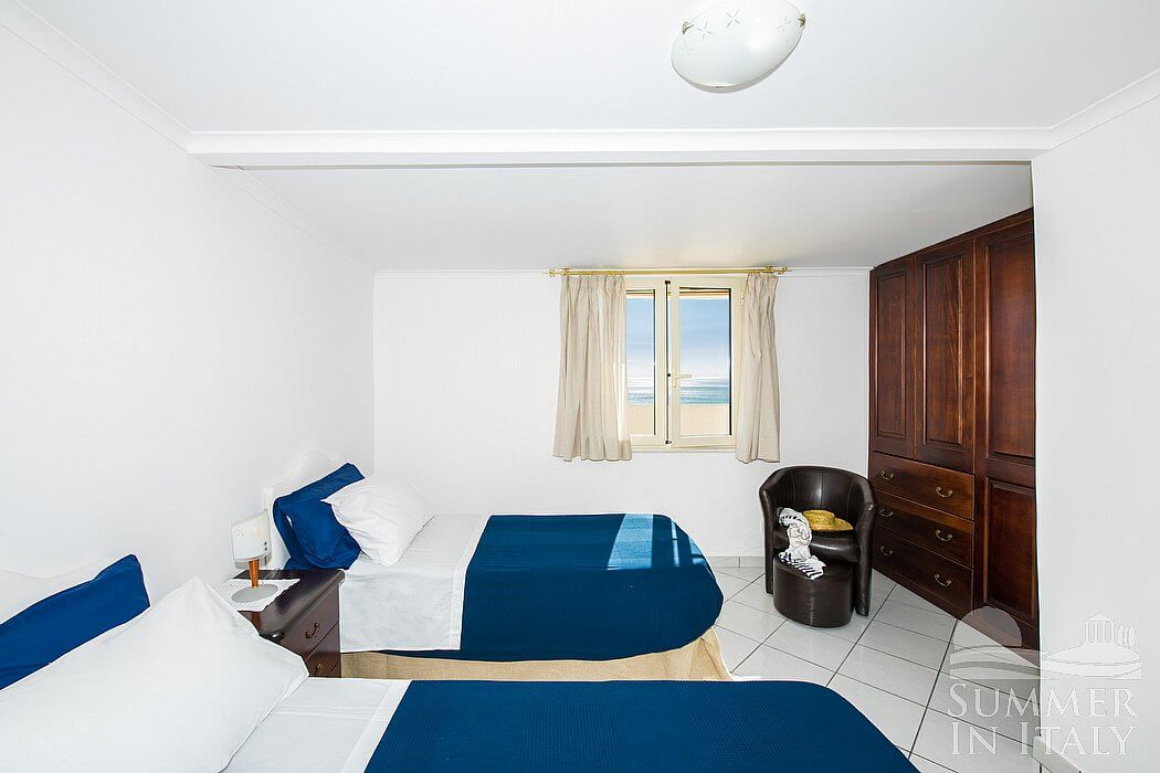 You will be able to enter the second bedroom from the corridor. It has two twin beds (80 cm/32 inches). The furnishings include a bedroom chair. The room has a double-glazed window with a view of the sea and of the terrace. The bedroom is equipped with an air conditioning/heating unit.