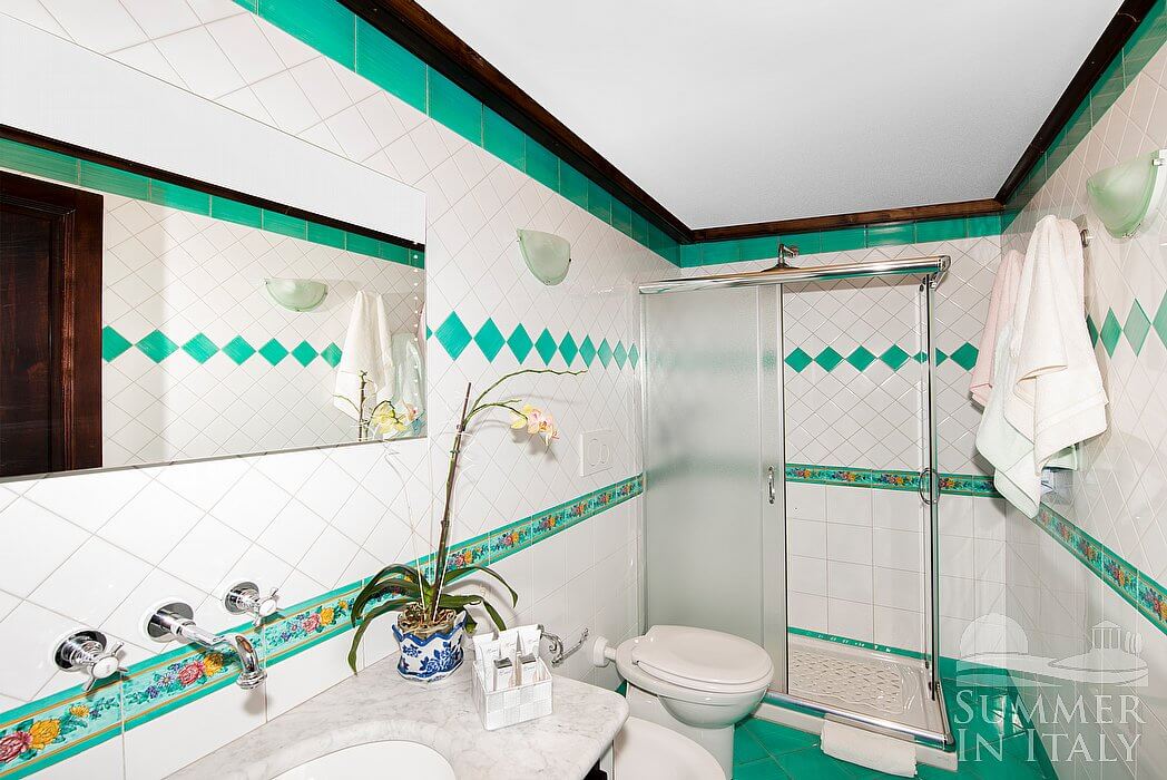 The bathroom is tiled with lucid handmade majolica tiles and equipped with a washbasin, a toilet, a fully enclosed shower and a hairdryer. You will be able to enter the bathroom from the corridor.