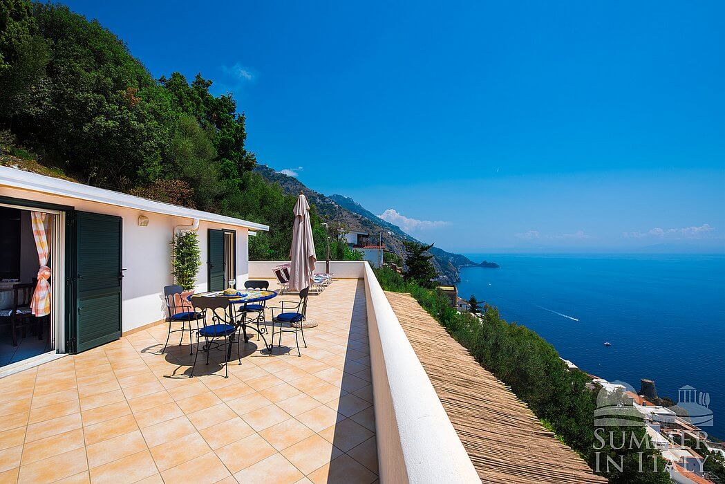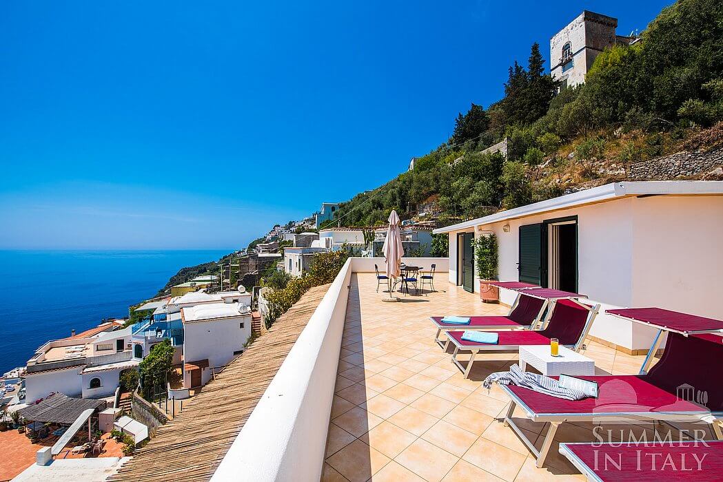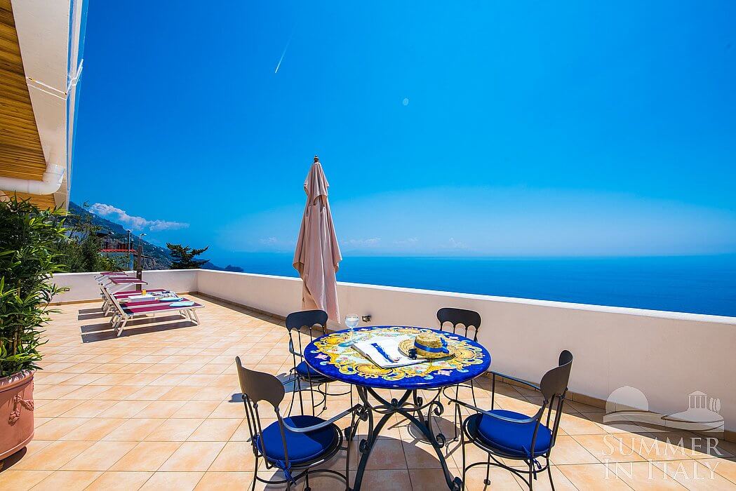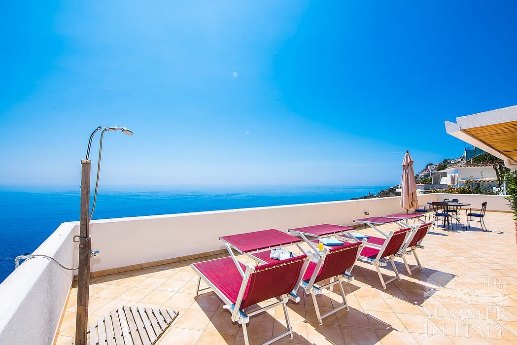 The terrace is 100 square meters (1076 square feet) large. It is equipped with a table, chairs, a sun umbrella, four sun loungers and an external shower. Here you will also find a barbecue. From the terrace you will enjoy a breathtaking view of the sea, of Praiano and the coast of Amalfi.