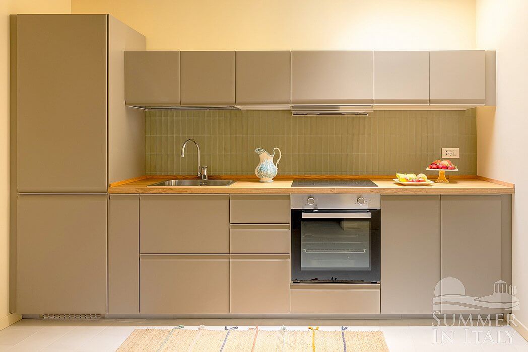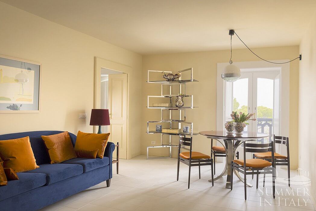 The living room is paved with terracotta tiles. The furnishings are simple and comfortable, and include a sofa. In the living room you will also find a cooking area. The kitchenette is equipped with a four-burner induction cooker, an electric oven, a refrigerator with freezer, an Italian-style coffee-maker and other small appliances. The dining table can accommodate four guests. In this room you will find a satellite smart TV. From the living room you will be able to enter the balcony with a view of the sea through a French door. The room is equipped with an air conditioning/heating unit.