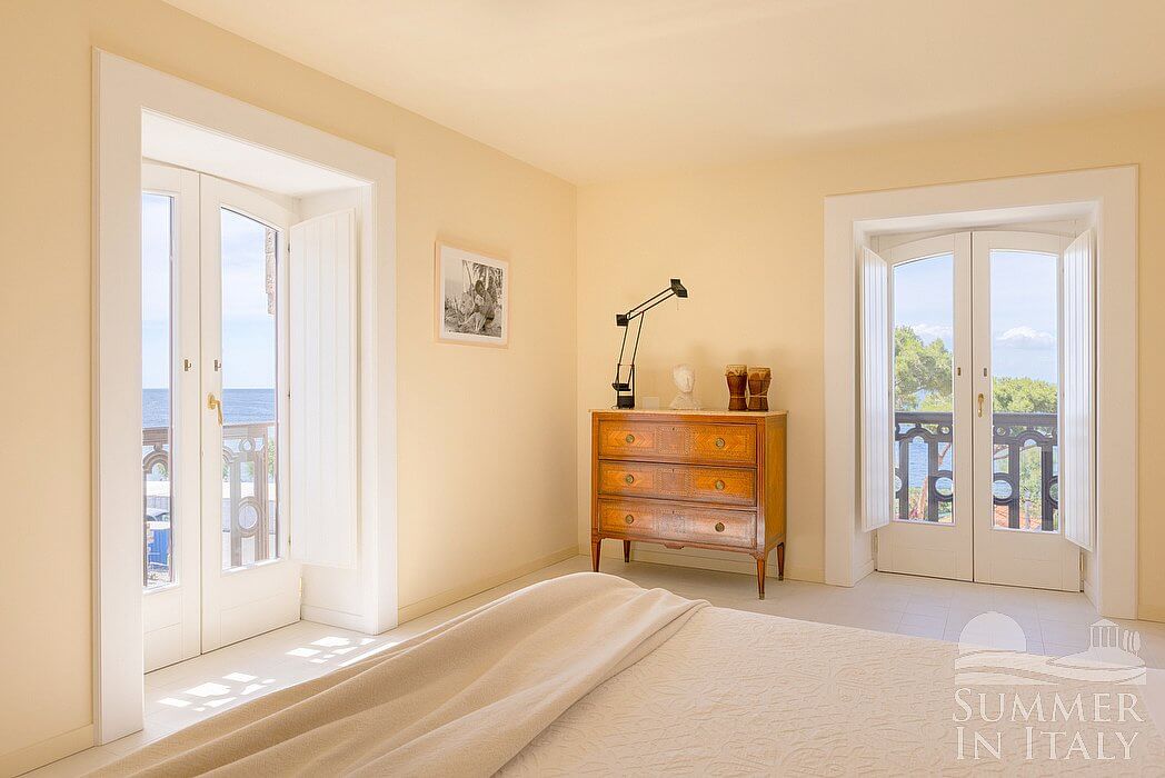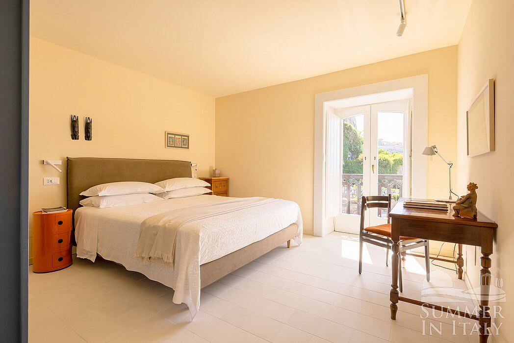 You will be able to enter the first bedroom from the living room. The bedroom has a matrimonial bed (160 cm/63 inches, wider than a queen-size bed). From the bedroom you will be able to enter two balconies with a view of the sea through two French doors. The bedroom is equipped with an air conditioning/heating unit.