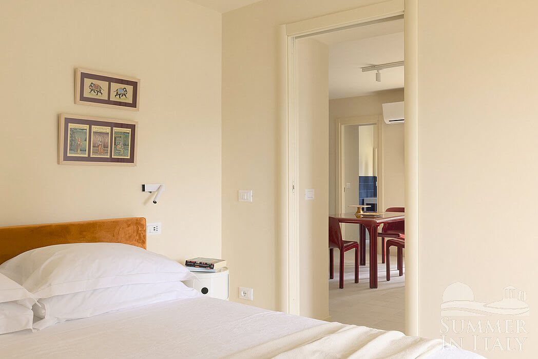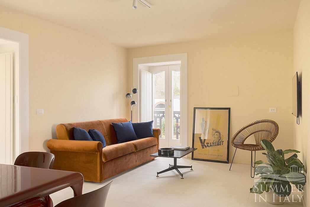 The furnishings of the living room are simple and comfortable, and include a sofa and an armchair. In the living room you will also find a cooking area. The kitchenette is equipped with a four-burner induction cooker, an electric oven, a refrigerator with freezer, an Italian-style coffee-maker and other small appliances. There is also a washing machine (hidden in a cabinet). The dining table can accommodate four guests. In this room you will find a satellite smart TV. From the living room you will be able to enter the small balcony through a French door. The room is equipped with an air conditioning/heating unit.