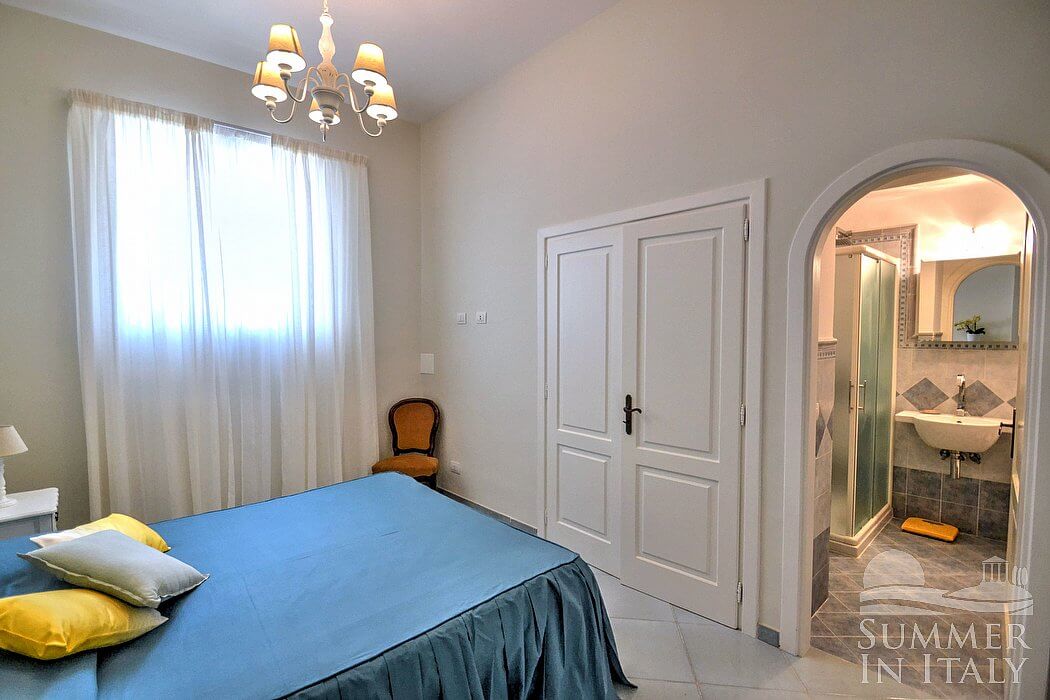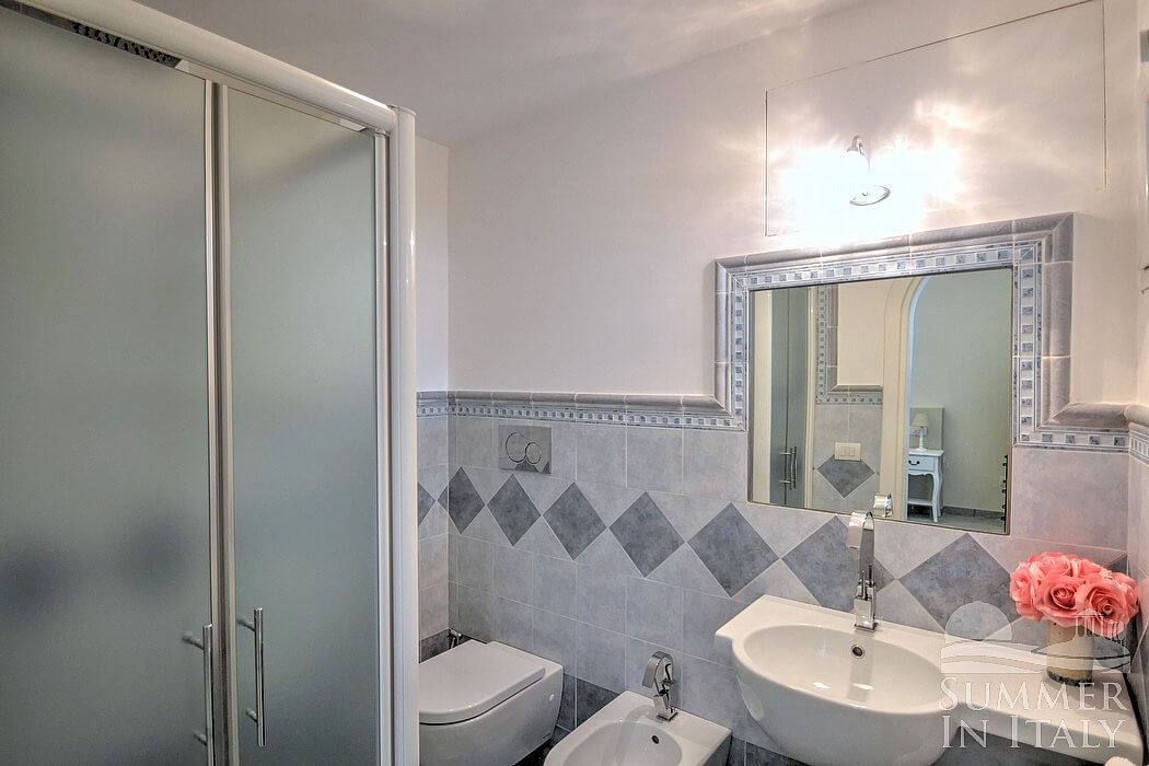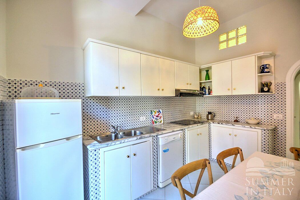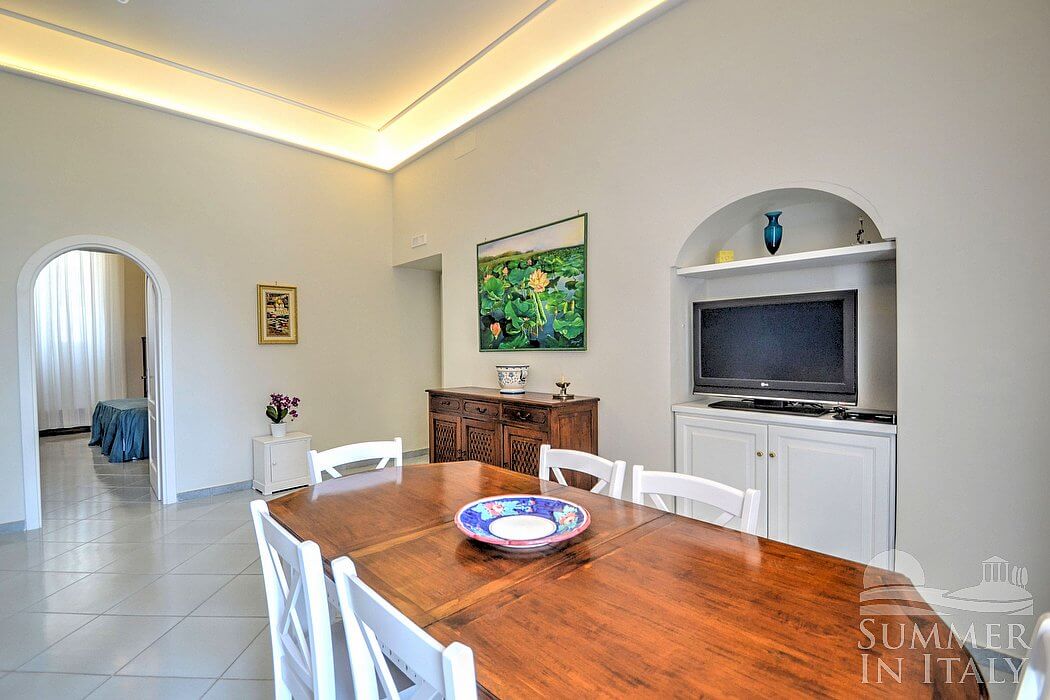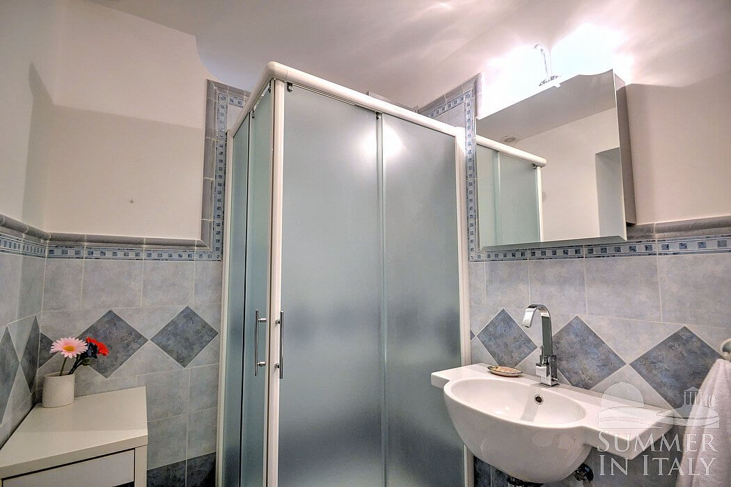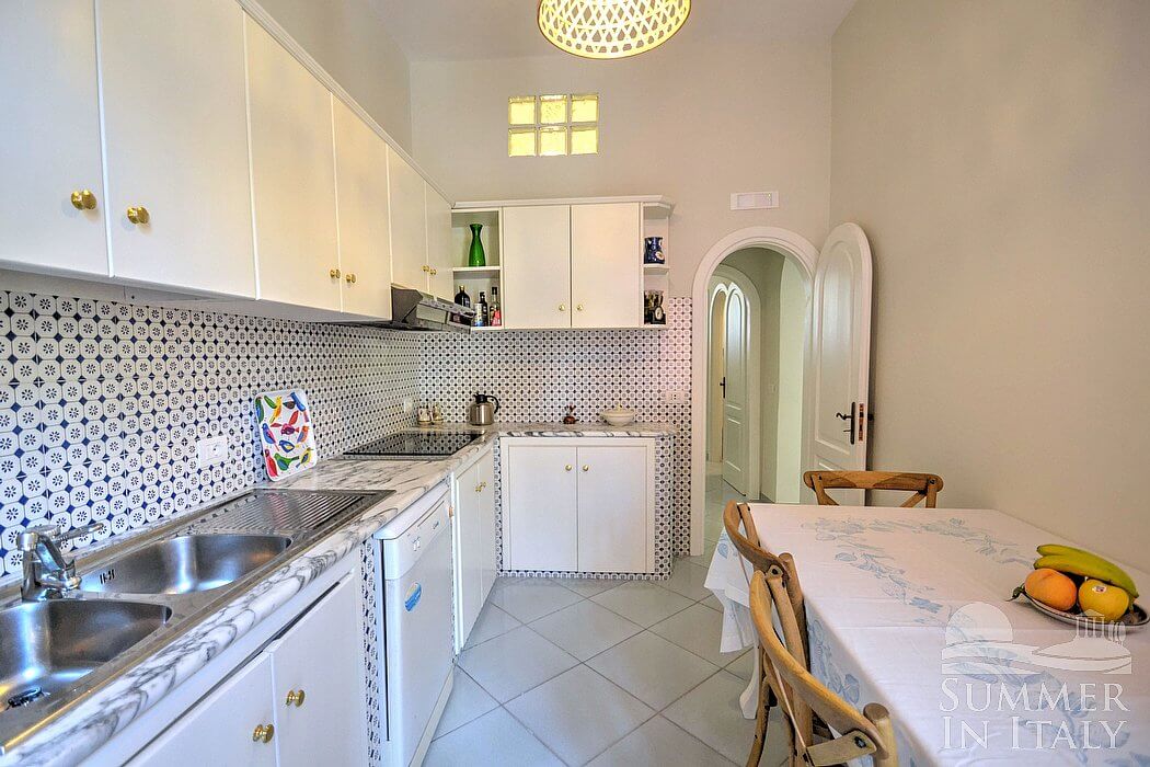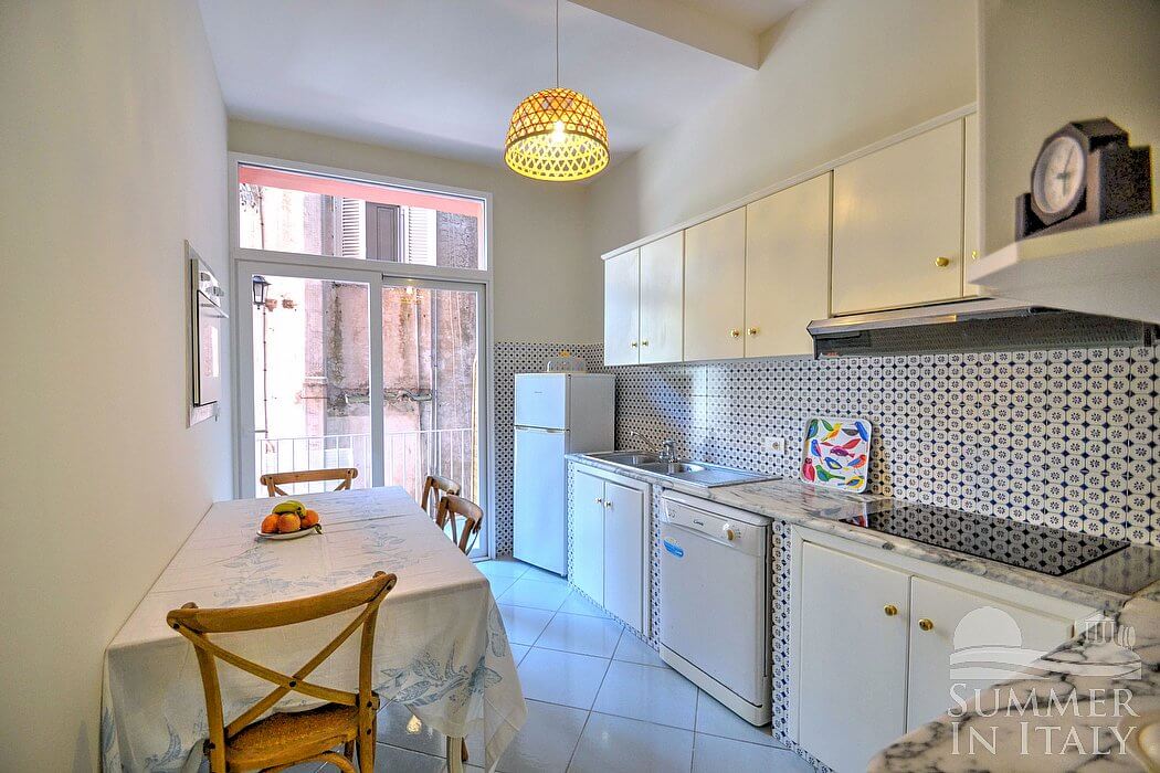 You will be able to enter the kitchen from the living room through an access area. It is equipped with a four-burner induction cooker, an electric oven, a refrigerator with freezer, a dishwasher and an Italian-style coffee-maker. The dining table can accommodate four guests. From the kitchen a French door will take you to the small balcony.