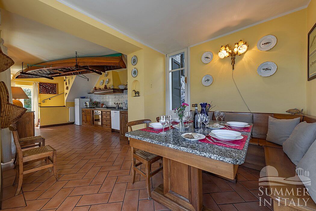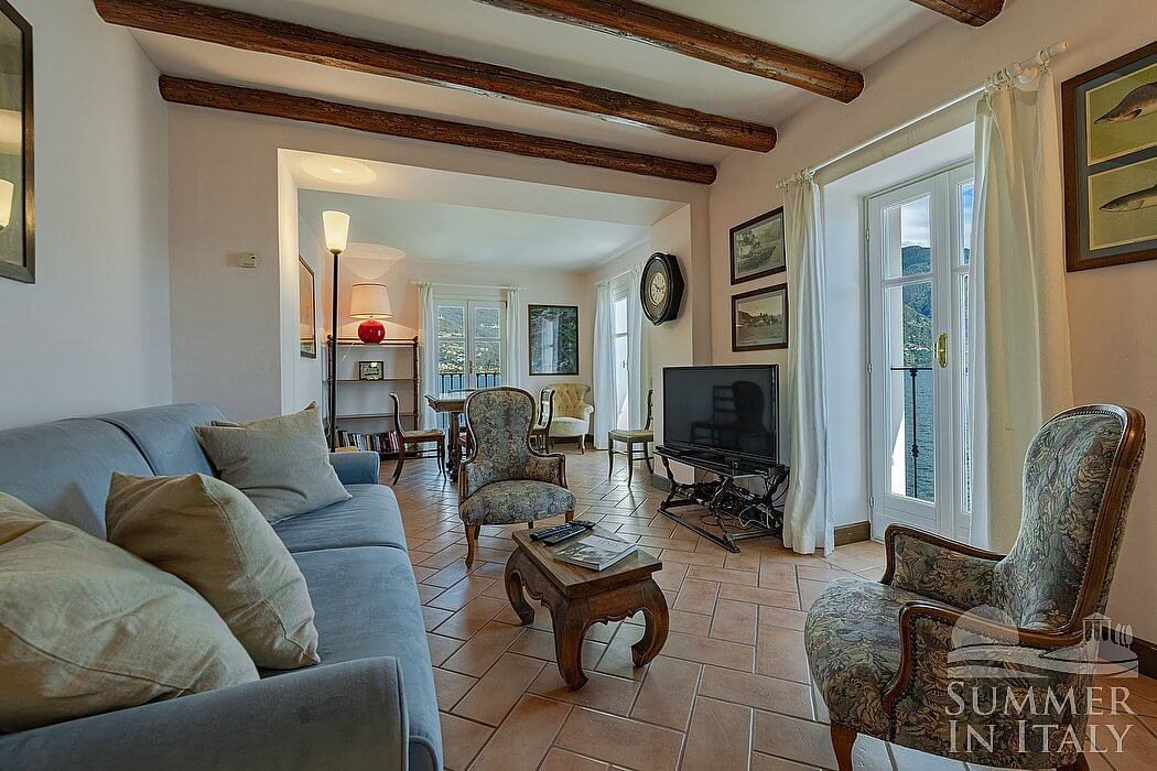 The living room is paved with terracotta tiles. The ceiling has characteristic exposed wood beams. The furnishings are warm and welcoming. The furnishings include a sofa and three armchairs. The dining table can accommodate six guests. In this room you will find a satellite television (local channels) and a DVD player. From the living room you will be able to enter the balcony with a view of the lake and of the mountains through a French door. The room also has two Juliet balconies with a view of the lake.