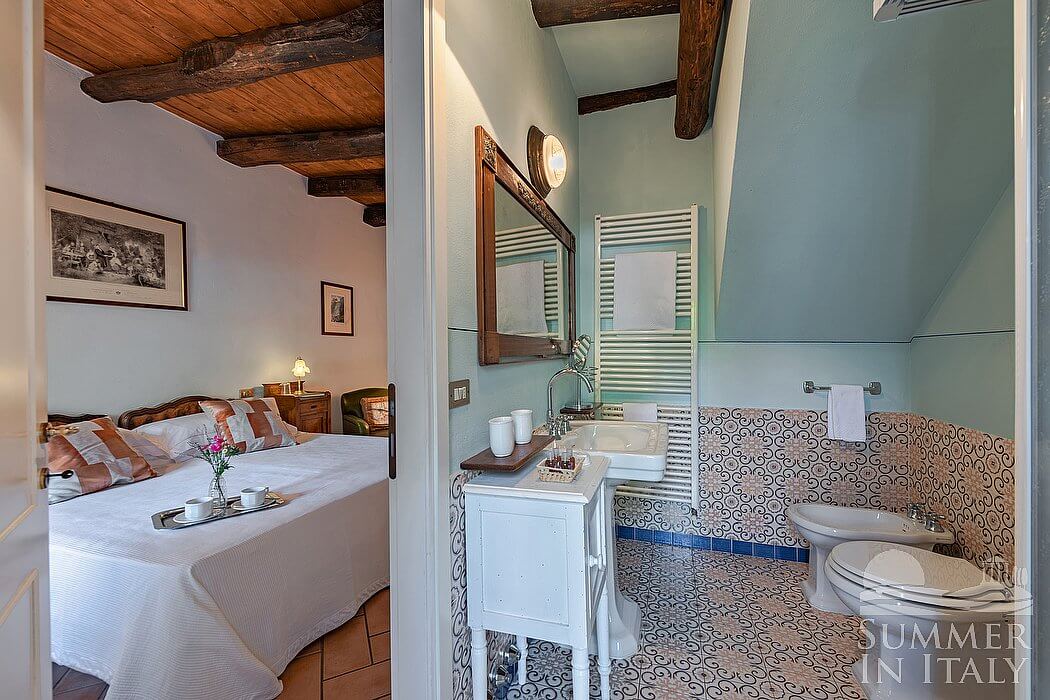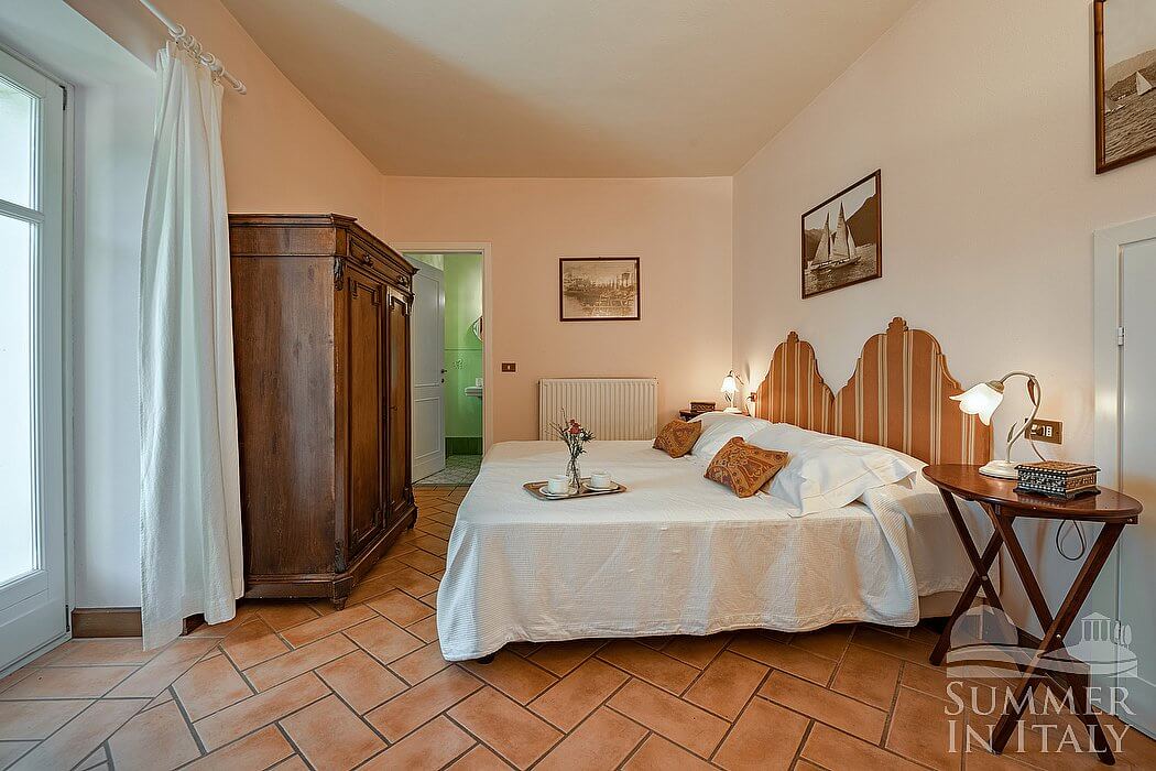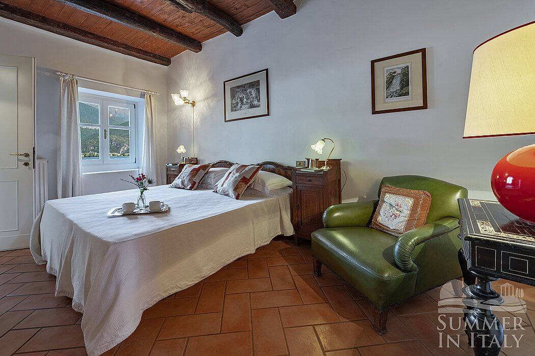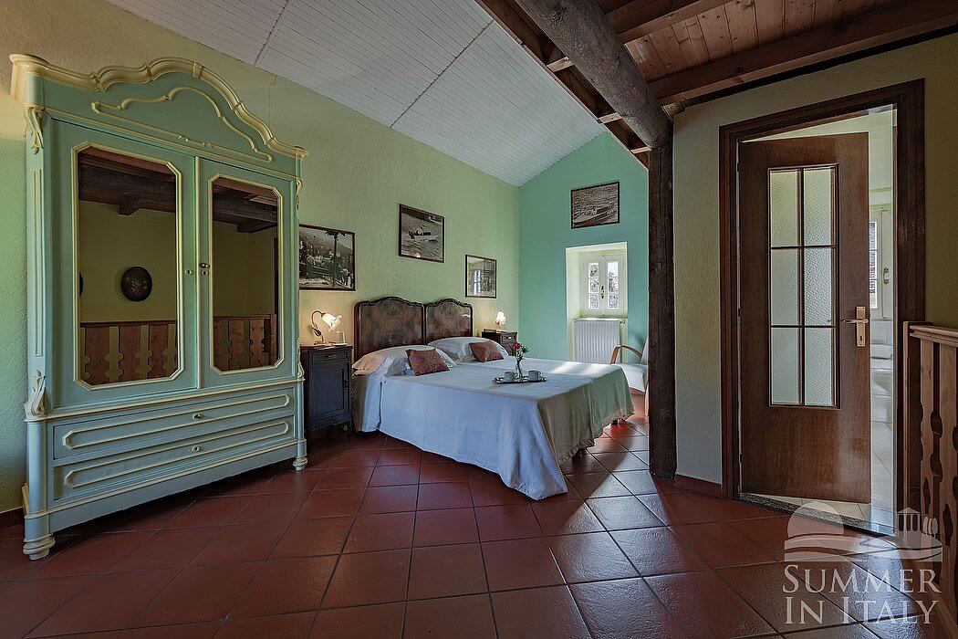 You will be able to enter the first bedroom from the corridor. The ceiling has characteristic exposed wood beams. The room has a traditional wooden matrimonial bed (160 cm/63 inches, wider than a queen-size bed). The furnishings include an armchair. The room has a window with a partial view of the lake. This bedroom has an en-suite bathroom, equipped with a washbasin, a toilet, a fully enclosed shower and a hairdryer.