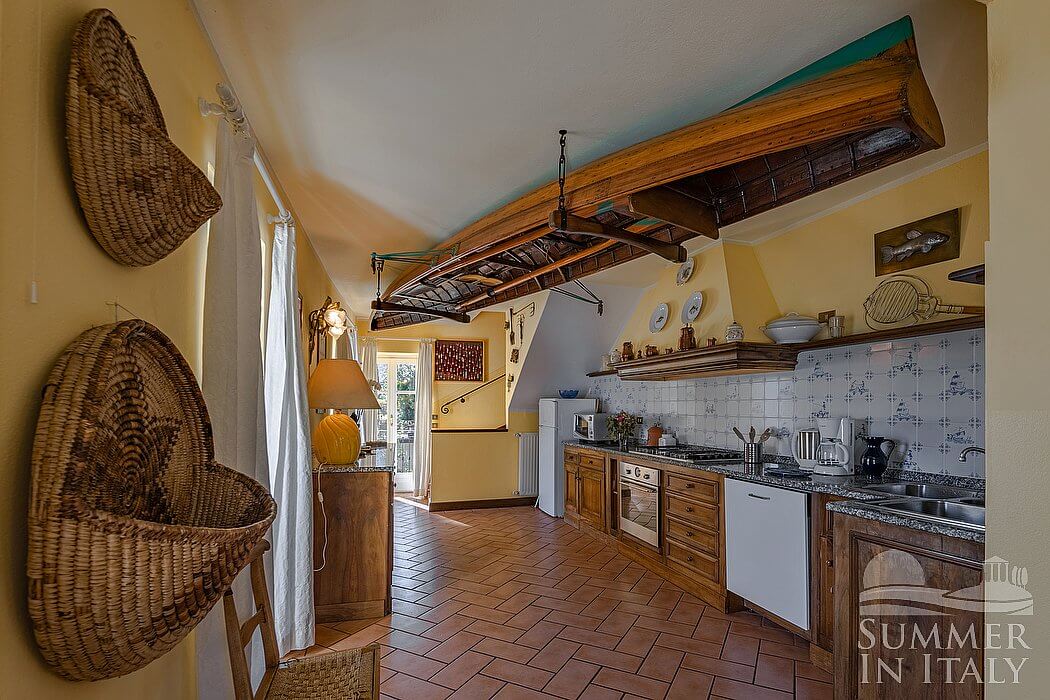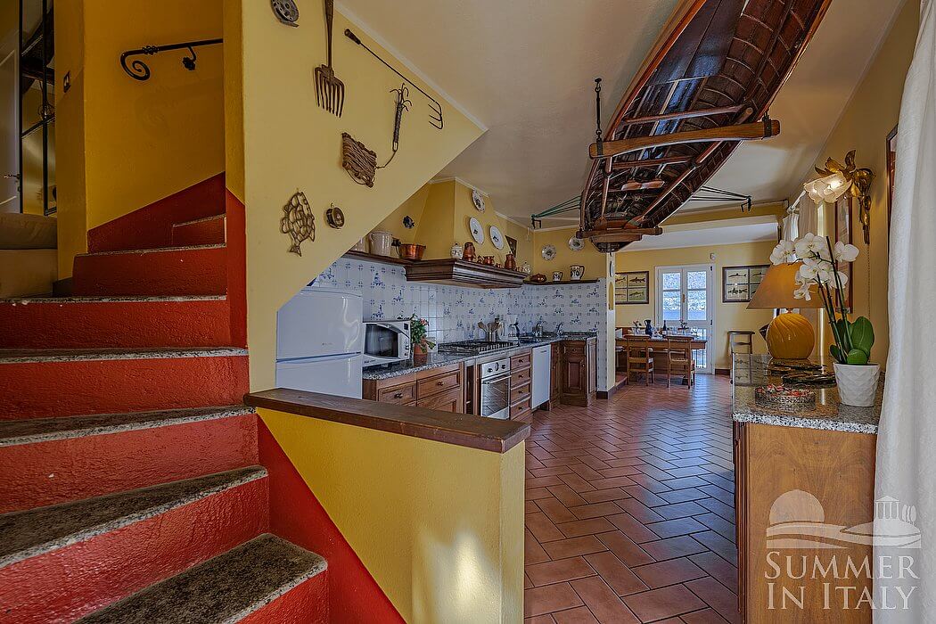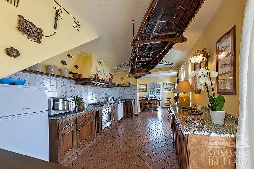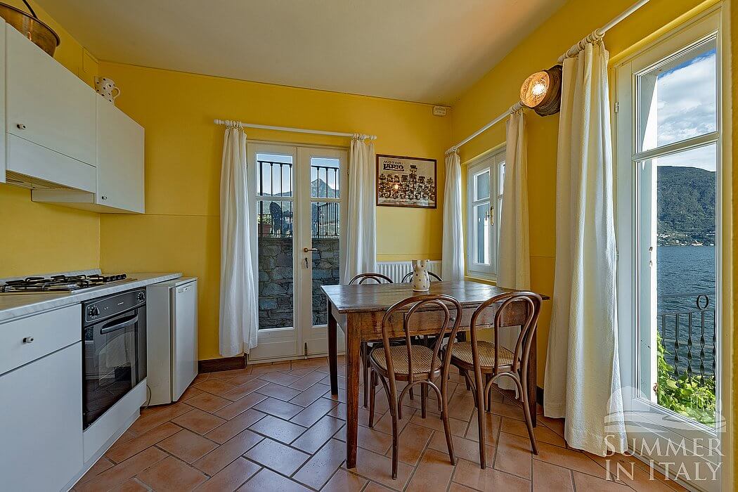 The second kitchen is equipped with a four-burner gas cooker, an electric oven, a small refrigerator without freezer and an Italian-style coffee-maker. The dining table can accommodate four guests. From the kitchen two French doors will take you to the third terrace. The room also has a window with a view of the lake.