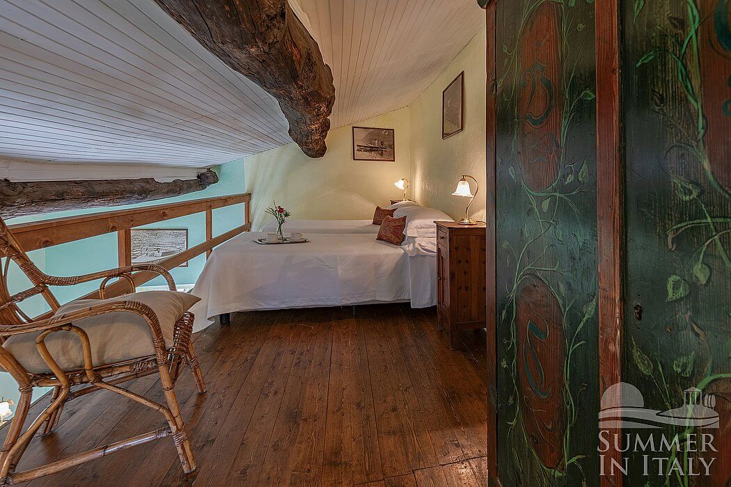 The ceiling of the second bedroom is sloped and has characteristic exposed wood beams. The room has a traditional wooden matrimonial bed (160 cm/63 inches, wider than a queen-size bed) and two twin beds (80 cm/32 inches), located on the mezzanine level . The furnishings include an armchair. The room has a window with a partial view of the lake. This bedroom has an en-suite bathroom, equipped with a washbasin, a toilet and a fully enclosed shower.