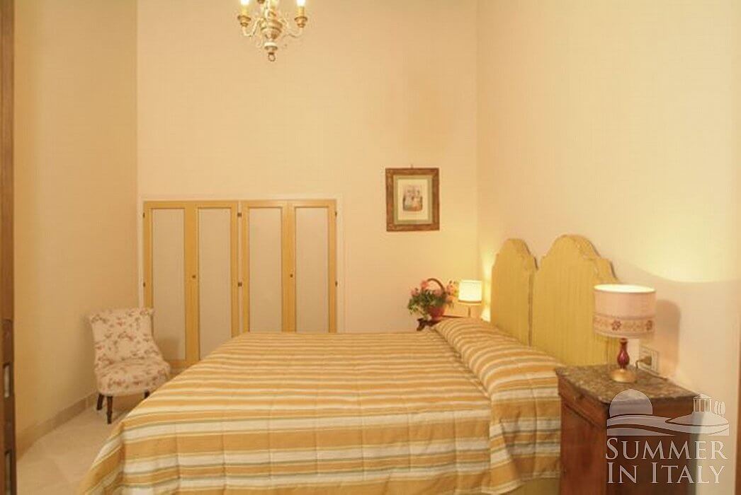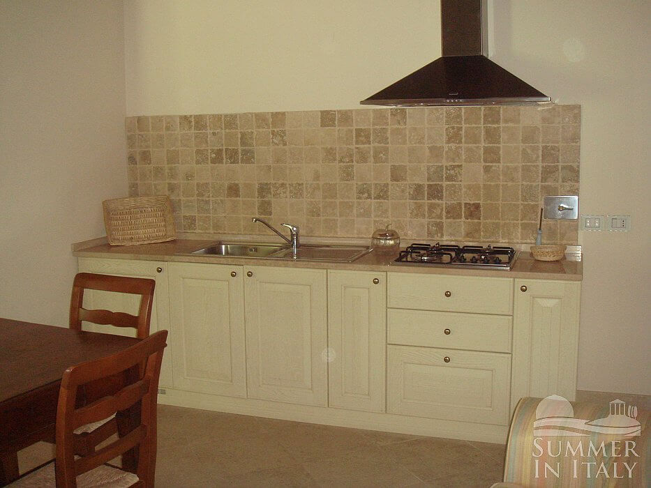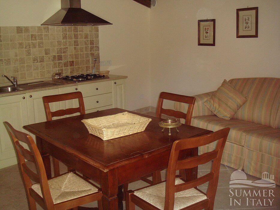 The living room is paved with stone tiles. The ceiling is sloped and has characteristic exposed wood beams. The furnishings are simple and comfortable. The furnishings include a sofa. In the living room you will also find a cooking area. The kitchenette is equipped with a four-burner gas cooker, a small refrigerator with freezer and an Italian-style coffee-maker. The dining table can accommodate four guests. From the living room you will be able to enter the garden through a French door.