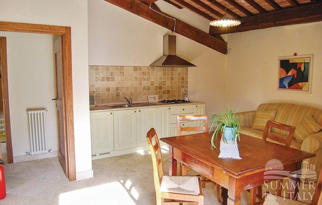 The swimming pool is 6 meters (20 feet) large by 12 meters (39 feet) long, from 80 centimeters (2.6 feet) to 1.5 meters (5 feet) deep. The area is equipped with deck chairs and sun loungers. From the swimming pool you will enjoy a pleasant view of the Tuscan countryside. You will share the pool with the other guests staying at the complex. The swimming pool is open from the beginning of May until the end of September.
