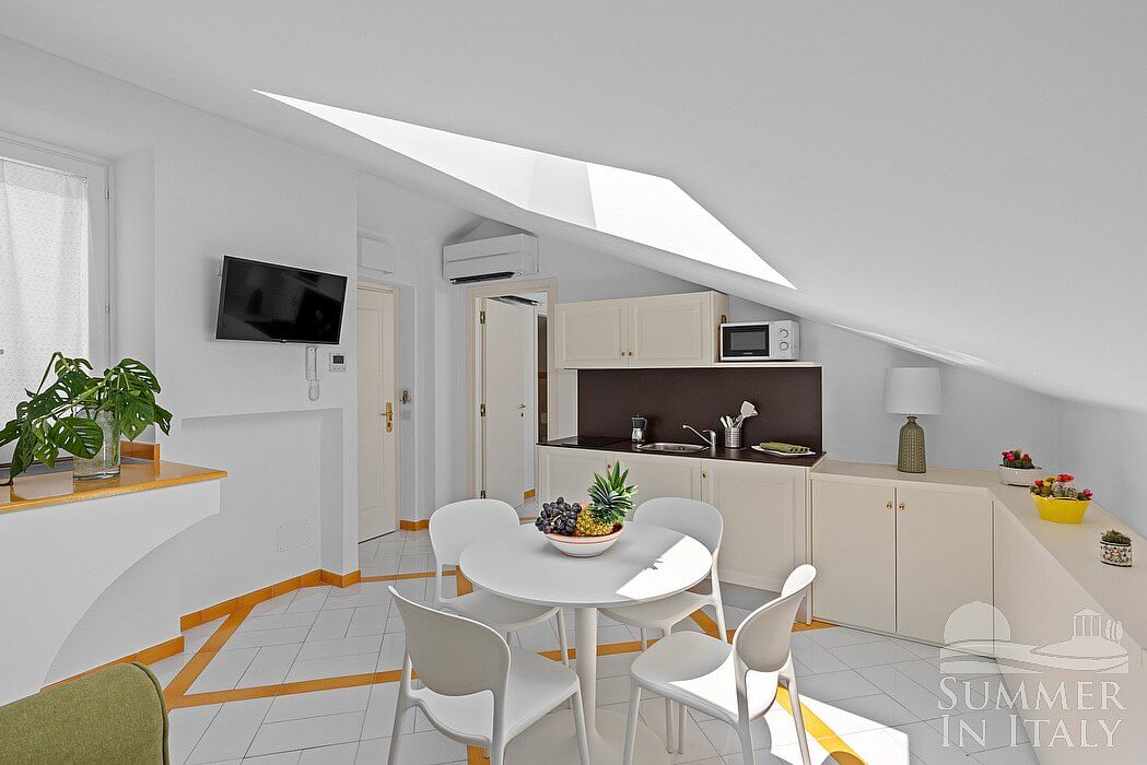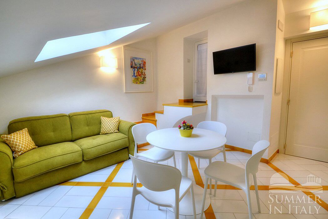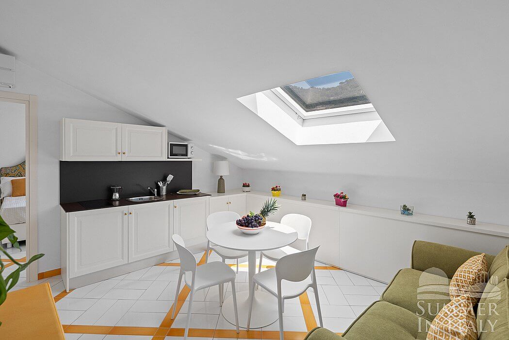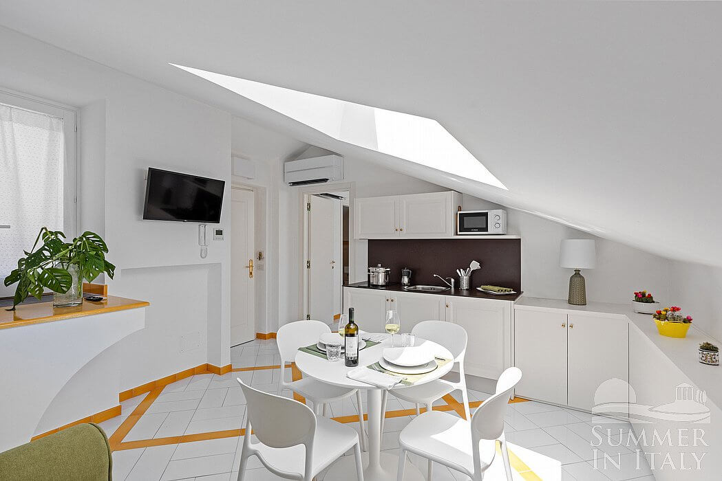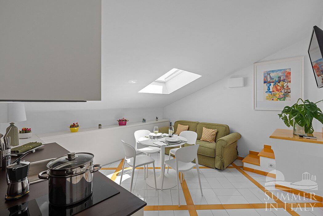 The ceiling of the living room is sloped and has an height of 1.40 meters (4.6 feet) at its lowest point. The furnishings are simple and comfortable, and include a divan that unfolds into a double bed. In the living room you will also find a cooking area. The kitchenette is equipped with a two-burner induction cooker, a microwave/oven combo, a small refrigerator with freezer, an Italian-style coffee-maker and a kettle. The dining table can accommodate four guests. In this room you will find a satellite television (local channels). From the living room you will be able to enter the small balcony through a French door. The room also has a double-glazed roof window. It is equipped with an air conditioning/heating unit.