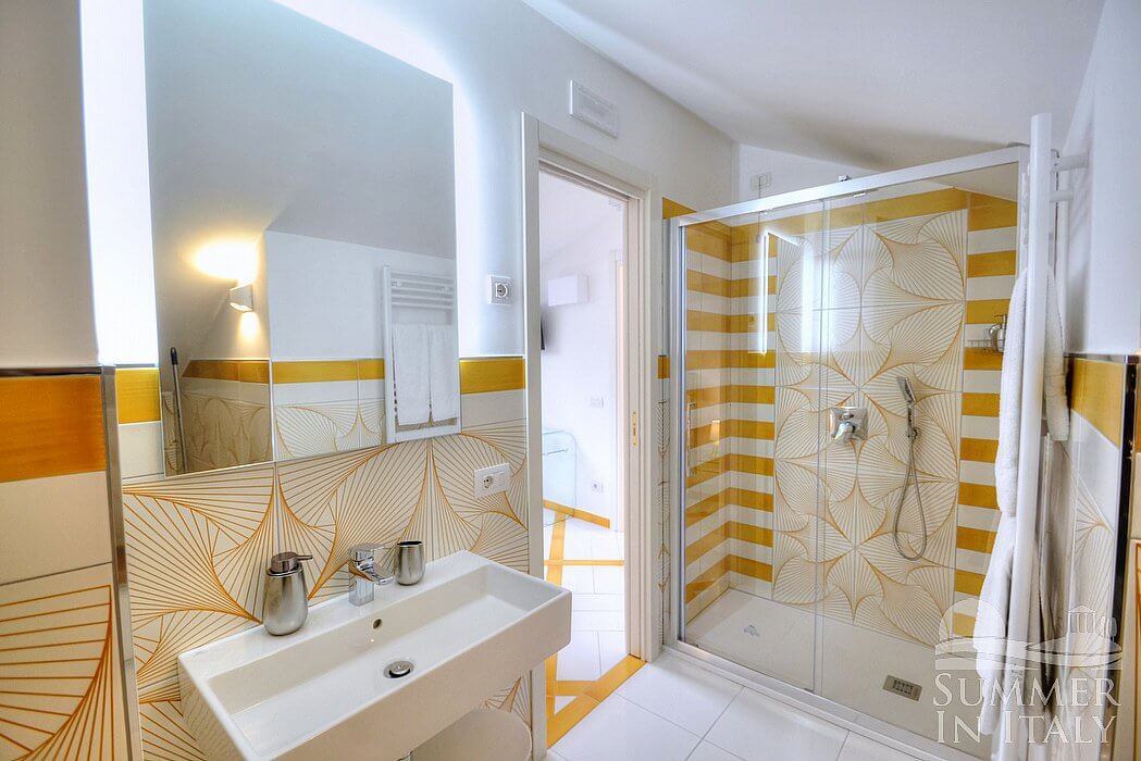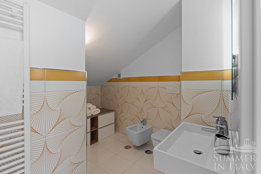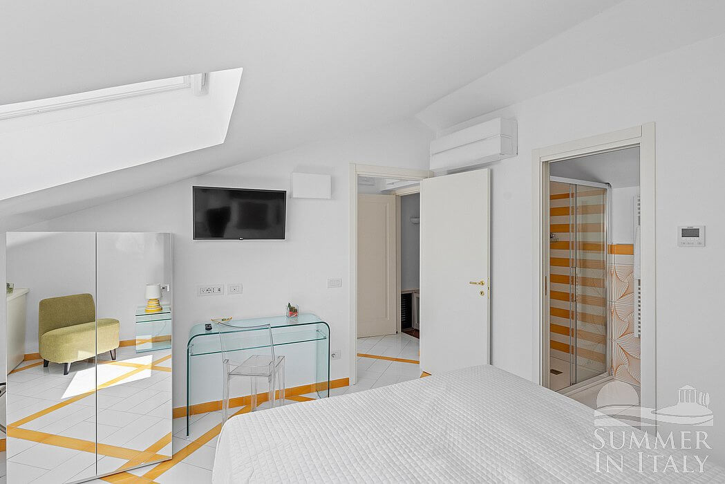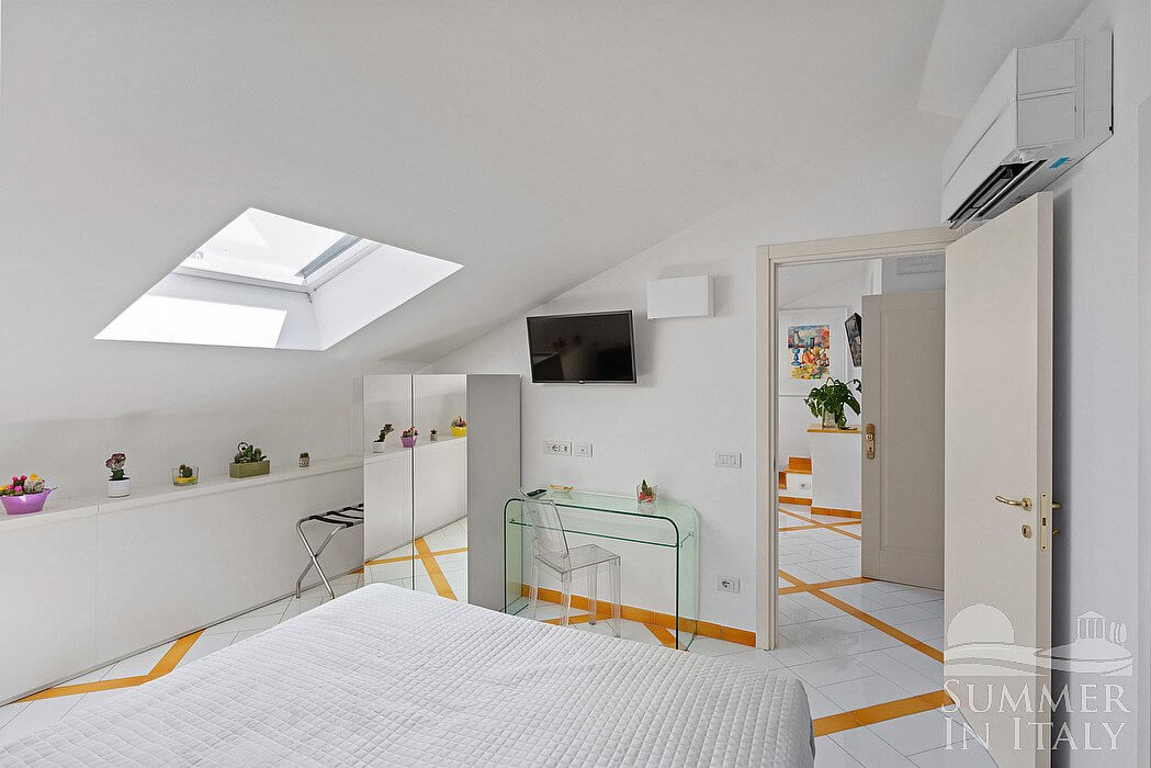 You will be able to enter the bedroom from the living room. The ceiling is sloped and has an height of 1.40 meters (4.6 feet) at its lowest point. The room has a matrimonial bed (160 cm/63 inches, wider than a queen-size bed). The furnishings include a bedroom chair. In this room you will find a satellite television (local channels). The room has a roof window, and it's equipped with an air conditioning/heating unit. This bedroom has an en-suite bathroom, decorated with majolica tiles and equipped with a washbasin, a toilet, a fully enclosed shower and a hairdryer.