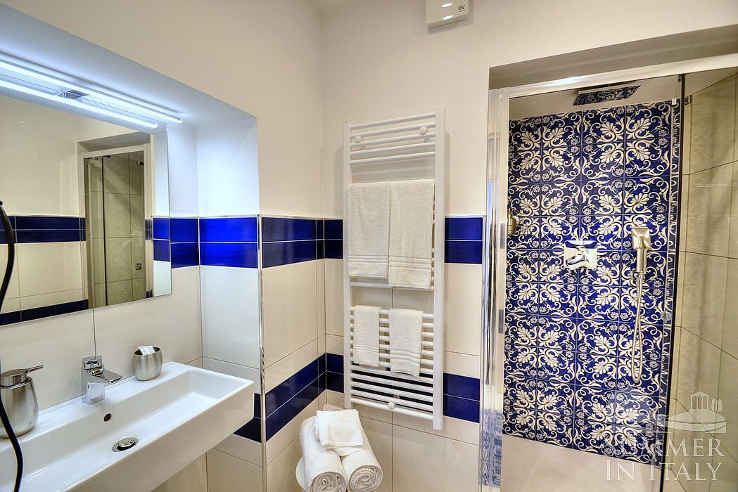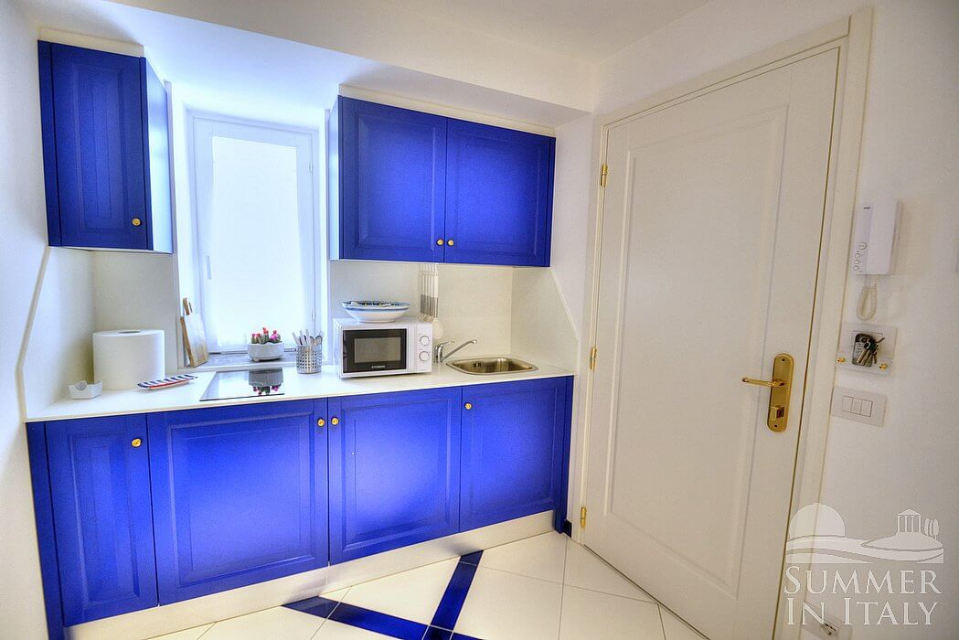 You will be able to enter the kitchen from the living room climbing two steps. It is equipped with a two-burner induction cooker, a microwave/oven combo, a small refrigerator with freezer, an Italian-style coffee-maker and a kettle. The kitchen has a small window, and is equipped with an air conditioning/heating unit.
