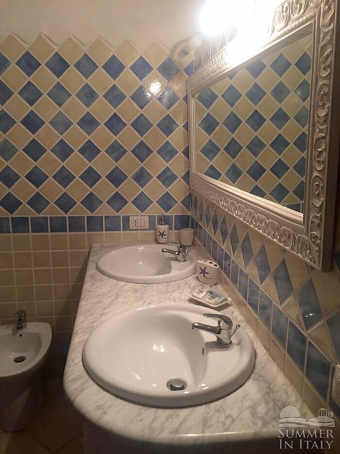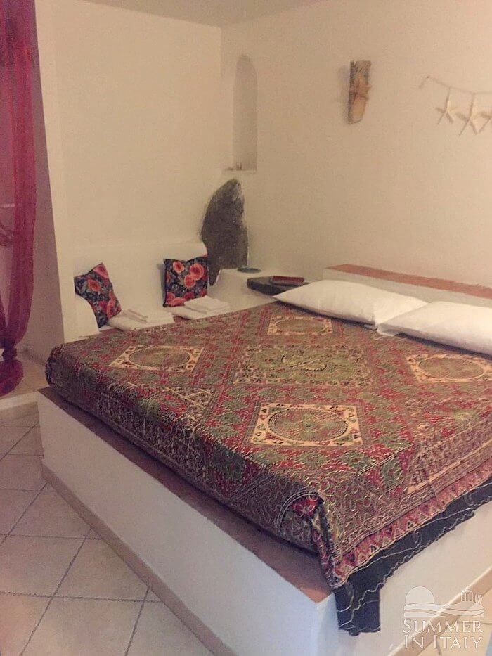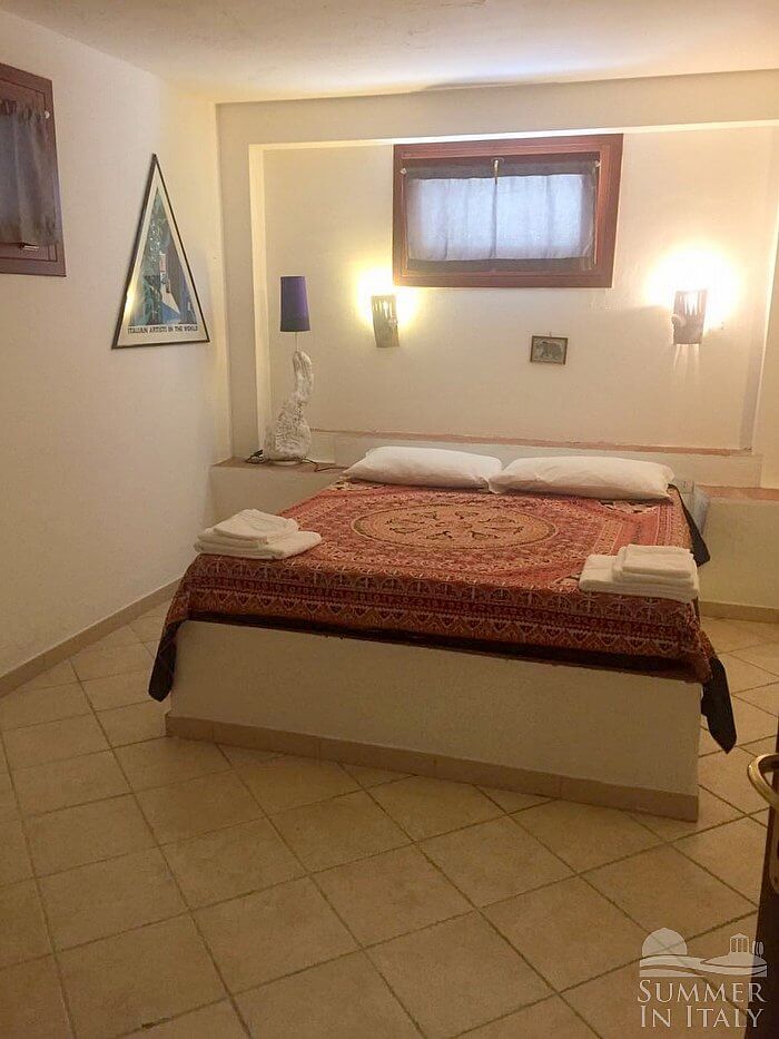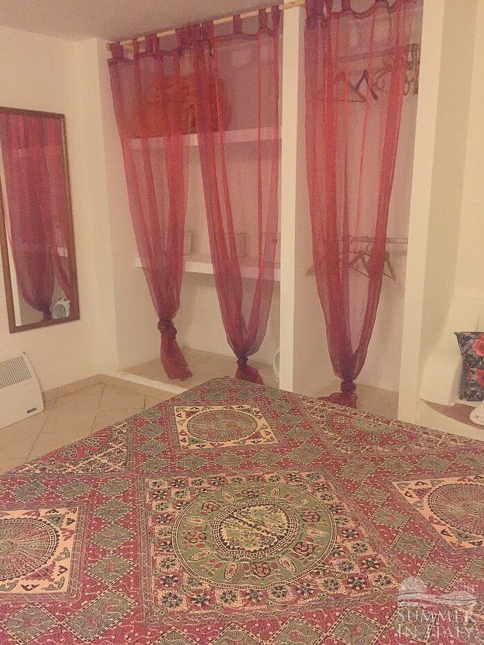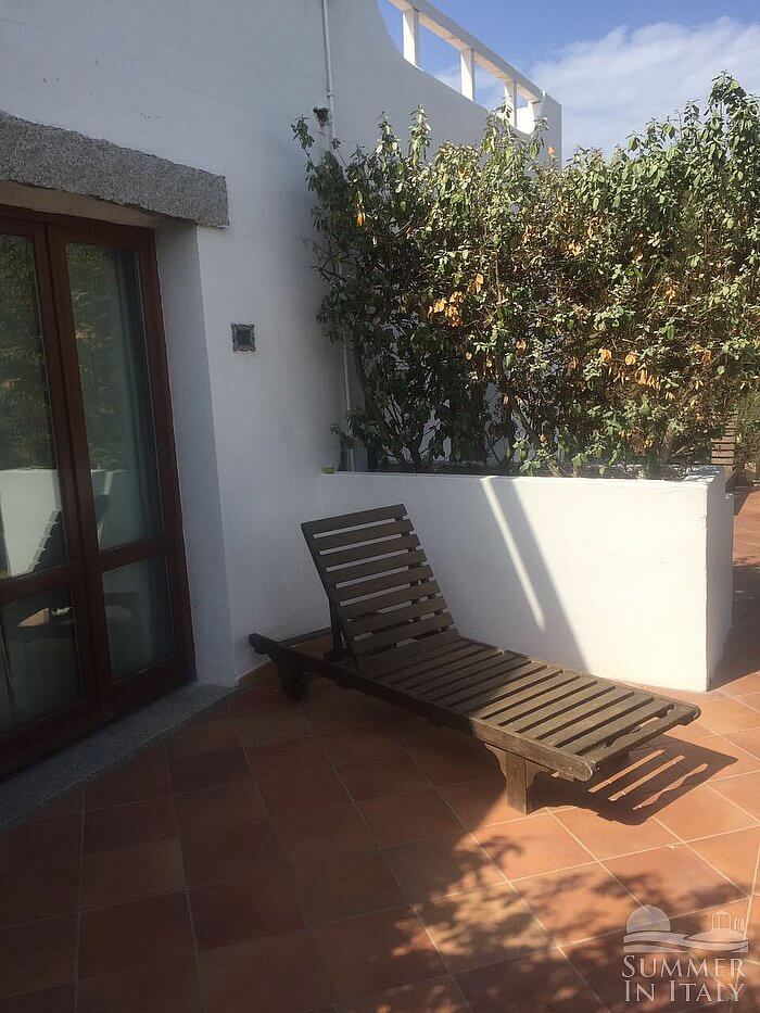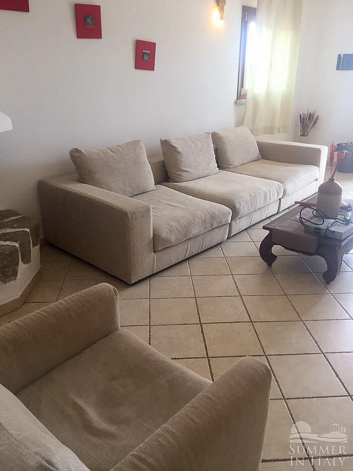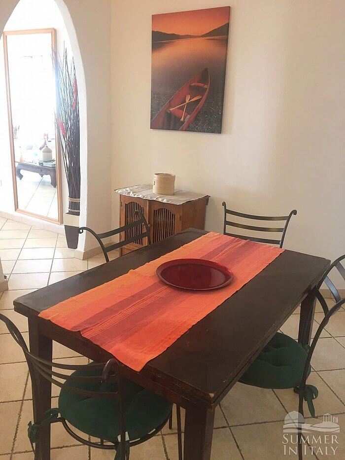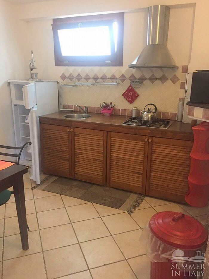 The furnishings of the living room are simple and comfortable. The furnishings include a sofa and an armchair. In the living room you will also find a cooking area. The kitchenette is equipped with a four-burner gas cooker, a refrigerator with freezer, a dishwasher and an Italian-style coffee-maker. The dining table can accommodate four guests. From the living room you will be able to enter the garden through a French door. The room also has two windows.
