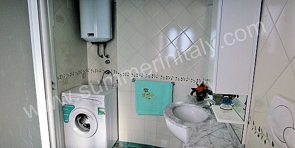 You will be able to enter the first bedroom from the corridor. The bedroom has a matrimonial bed (160 cm/62 inches, wider than a queen-size bed). From the bedroom you will be able to enter the terrace with a view of the sea and of the coastline through a French door. The bedroom is equipped with an air conditioning/heating unit. This bedroom has an en-suite bathroom, equipped with a washbasin, a toilet and a fully enclosed shower. Here you will also find a washing machine.