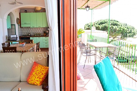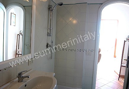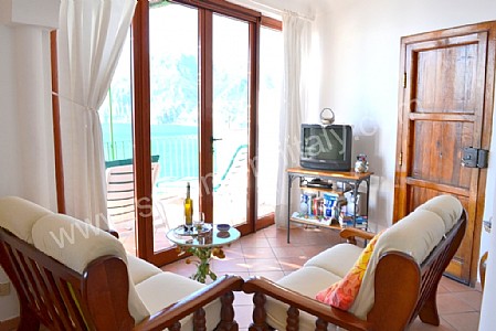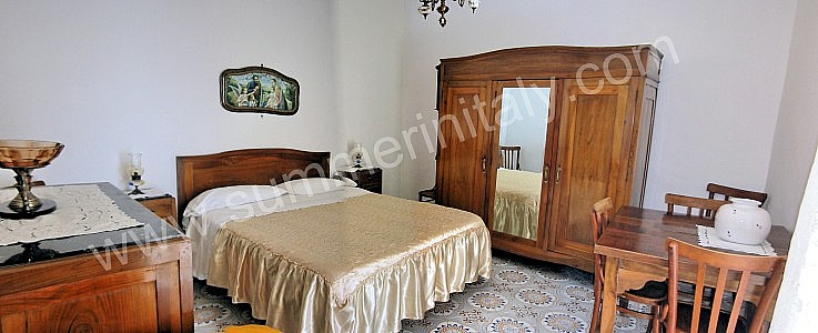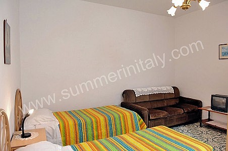 The living room is paved with terracotta tiles. The furnishings are cozy and comfortable. The furnishings include two small sofas. In the living room you will also find a cooking area. The kitchenette is equipped with a four-burner gas cooker, an electric oven, a refrigerator with freezer, an Italian-style coffee-maker, an American-style coffee-maker (bring your filters!) and a kettle. The dining table can accommodate five guests. In this room you will find a television (local channels). From the living room you will be able to enter the terrace with a view of the sea through two French doors. The room has a window with a view of the sea and of the coastline. It is equipped with an air conditioning/heating unit.