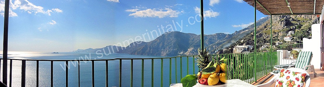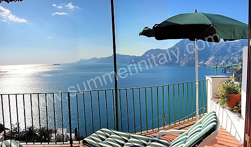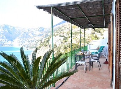 The terrace is 40 square meters (430 square feet) large. It is partly shaded by a pergola with a bamboo roof. It is equipped with a table, chairs, a sun umbrella and two sun loungers. Here you will also find a portable barbecue. From the terrace you will enjoy an enchanting view of the sea and of the coast of Amalfi.
