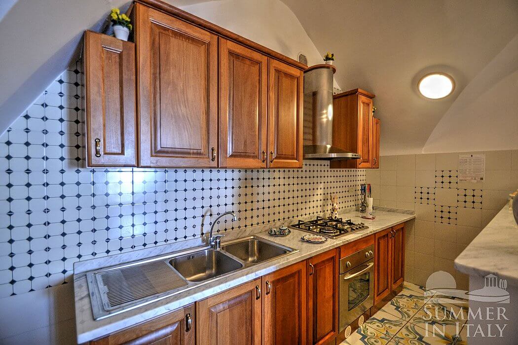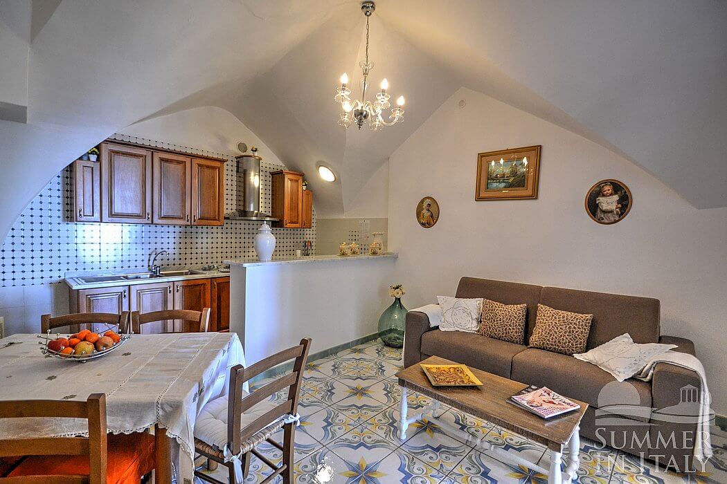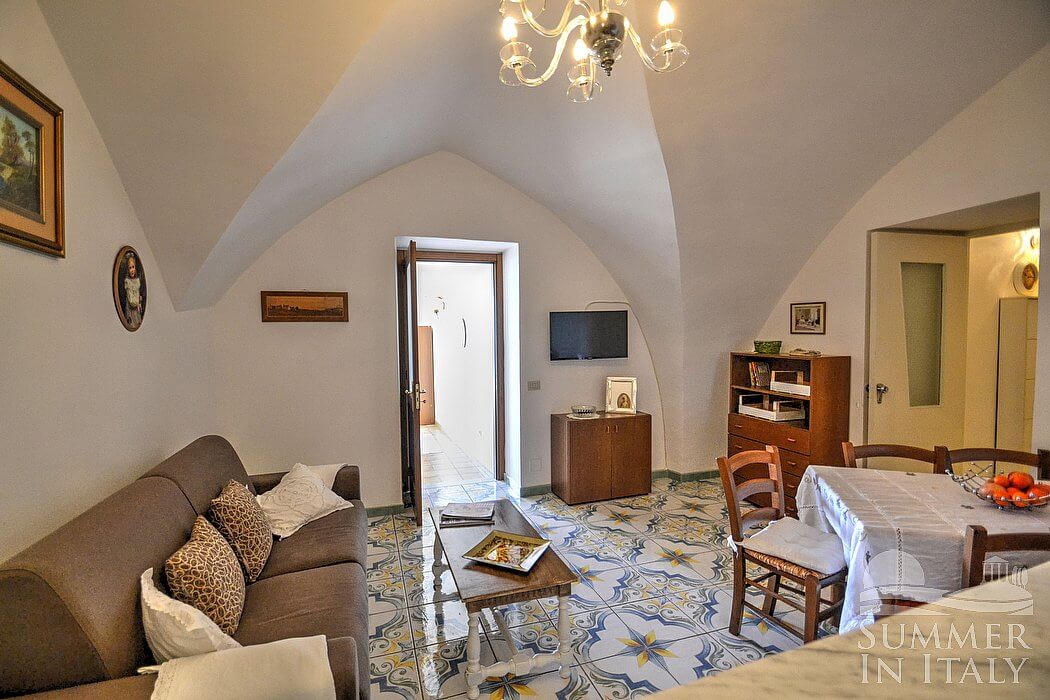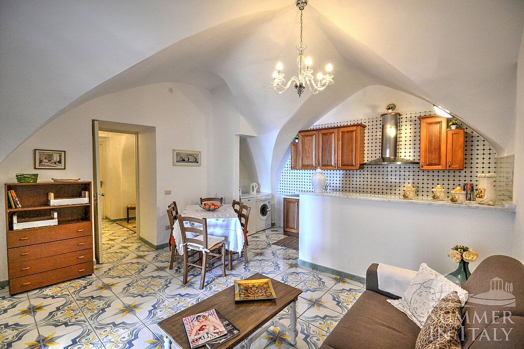 The living room is paved with majolica tiles with handmade decoration, in the characteristic style of the Amalfi Coast. The ceiling boasts a cross vault. The furnishings are cozy and comfortable. The furnishings include a divan that unfolds into a double bed (available upon request -- please contact our staff in advance). In the living room you will also find a cooking area. The kitchenette is equipped with a four-burner gas cooker, an electric oven, a small refrigerator with freezer, an Italian-style coffee-maker and a kettle. There is also a washing machine, an iron and an ironing board. The dining table can accommodate five guests. In this room you will find a television (local channels). The room is equipped with an air conditioning/heating unit.